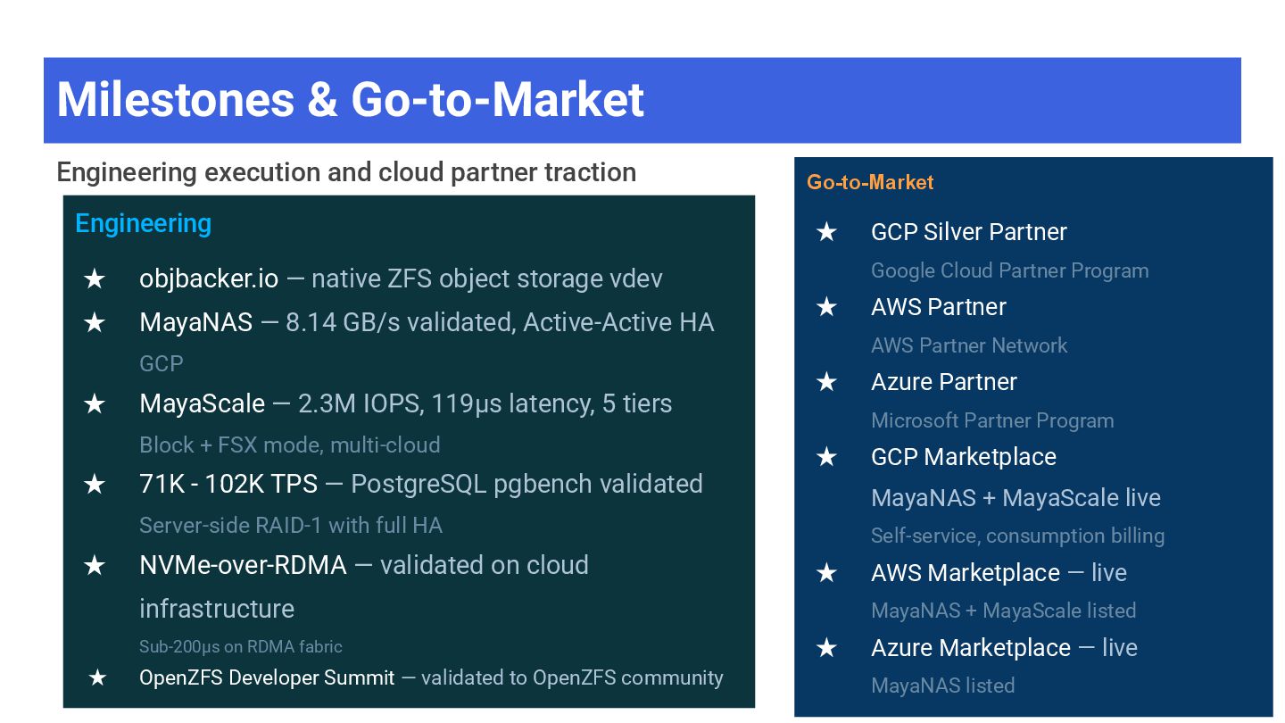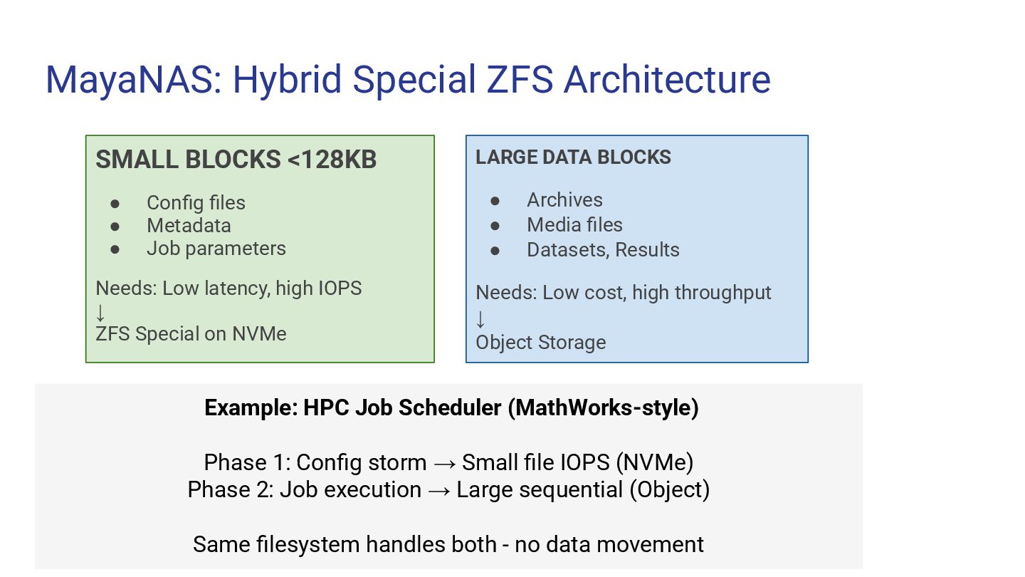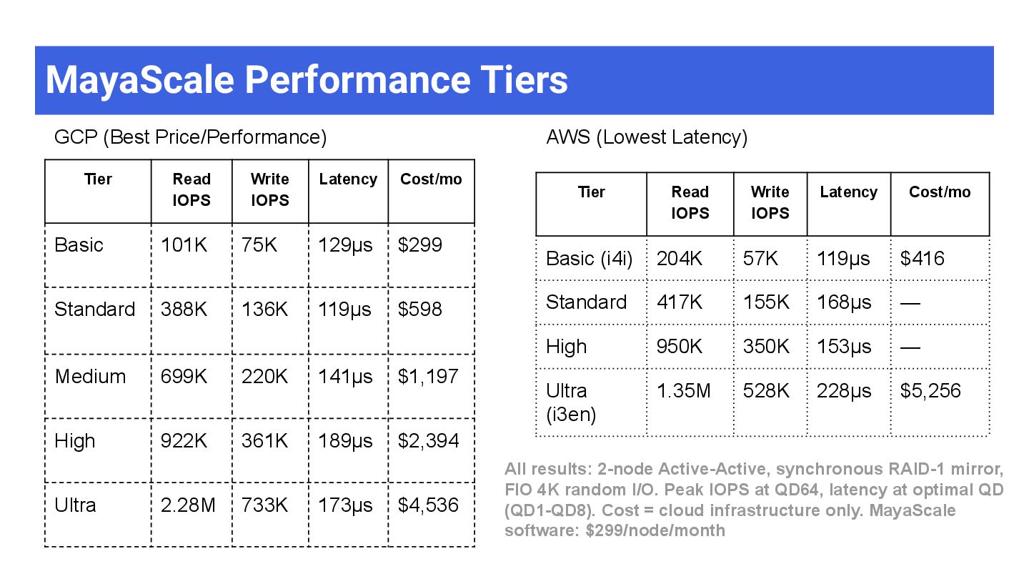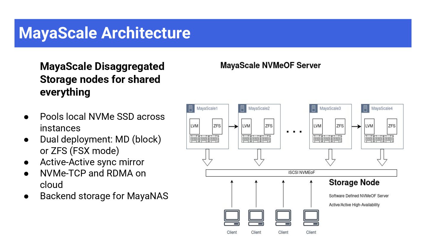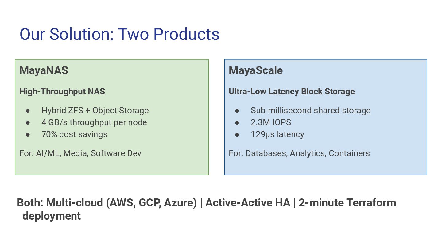 High-throughput file storage · NFS · ZFS + S3 ➢ AI/ML training datasets — large files, sequential I/O ➢ Media & entertainment — video editing, rendering ➢ Data analytics — data lakes, ETL pipelines ➢ Software development — build artifacts, containers ➢ Backup & archive — cost-effective on object storage MayaScale Low-latency block + file storage · NVMe-oF · Local SSDs ➢ High-performance databases — PostgreSQL, MySQL, Oracle ➢ Real-time analytics — ClickHouse, Druid, TimescaleDB ➢ Kubernetes PVs — CSI driver, persistent volumes ➢ FSX replacement — OpenZFS NFS where FSX unavailable ➢ CI/CD build systems — fast local storage for builds