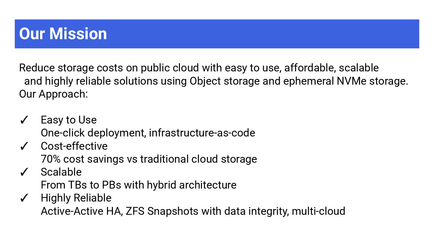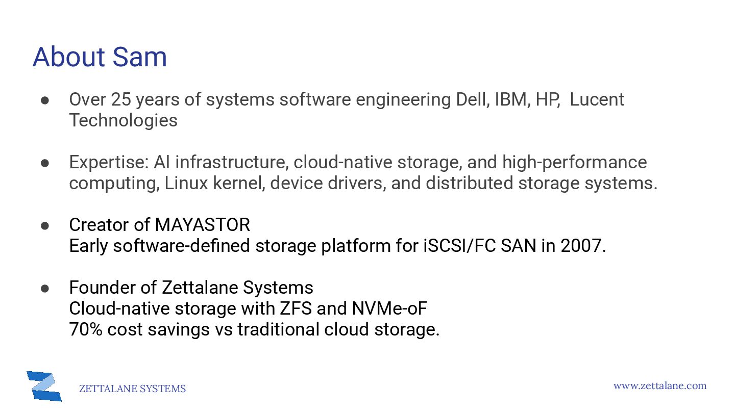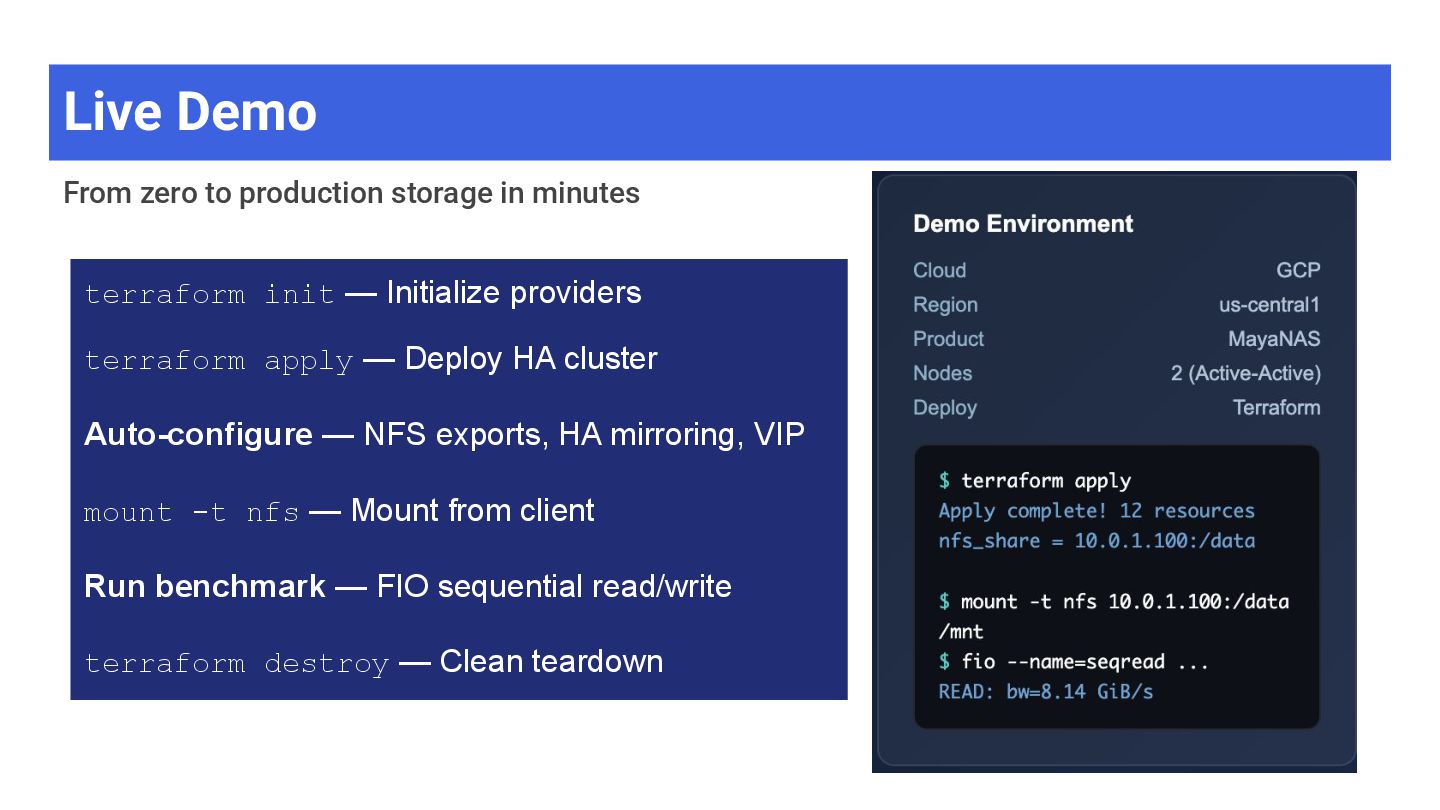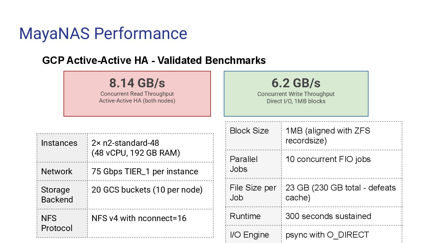 High-throughput file storage · NFS · ZFS + S3 ➢ AI/ML training datasets — large files, sequential I/O ➢ Media & entertainment — video editing, rendering ➢ Data analytics — data lakes, ETL pipelines ➢ Software development — build artifacts, containers ➢ Backup & archive — cost-effective on object storage MayaScale Low-latency block + file storage · NVMe-oF · Local SSDs ➢ High-performance databases — PostgreSQL, MySQL, Oracle ➢ Real-time analytics — ClickHouse, Druid, TimescaleDB ➢ Kubernetes PVs — CSI driver, persistent volumes ➢ FSX replacement — OpenZFS NFS where FSX unavailable ➢ CI/CD build systems — fast local storage for builds