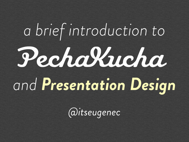 20 seconds x 20 slides done for short Sharing Session amongst student interest group. Slides introduce Pecha Kucha & Presentation Design Concepts. Additional 2 slides used for credits.