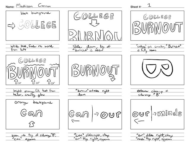 The storyboard frames of 3 separate videos made in Adobe After Effects for a summer Motion Graphics course.