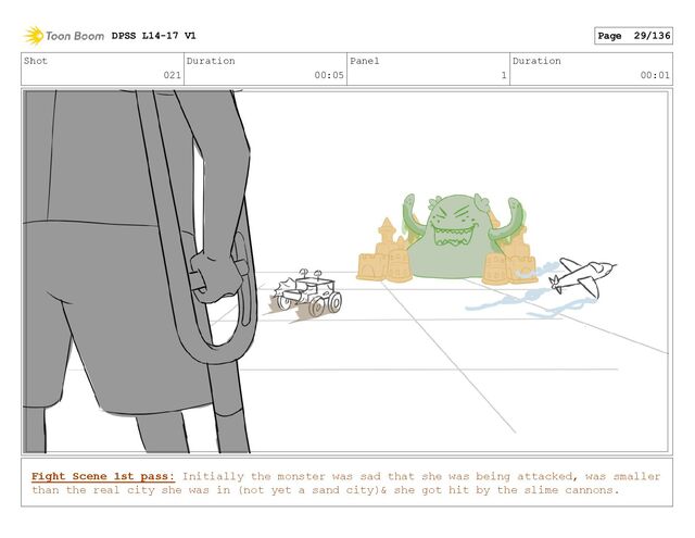 V1 Page 29/136 Fight Scene 1st pass: Initially the monster was sad that she was being attacked, was smaller than the real city she was in (not yet a sand city)& she got hit by the slime cannons.