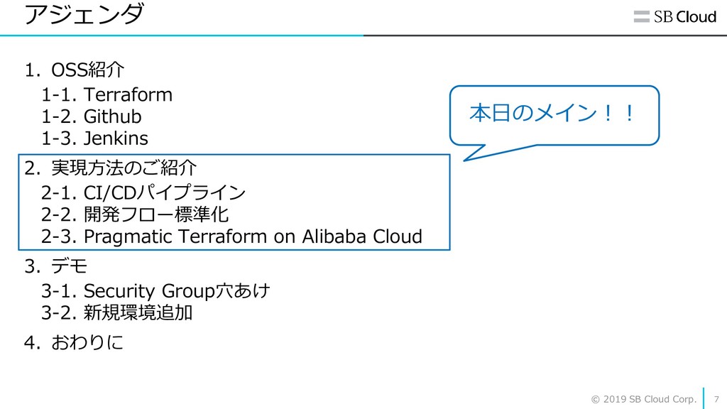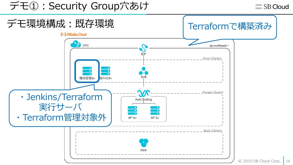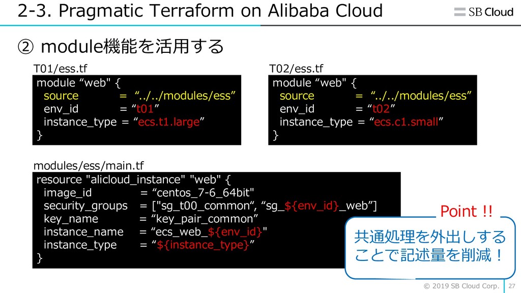 Cloud 26 ② module機能を活用する T01/ess.tf resource "alicloud_instance" "web" { image_id = “centos_7-6_64bit" security_groups = ["sg_t00_common“, “sg_t01_web”] key_name = “key_pair_common” instance_name = “ecs_web_t01" instance_type = “ecs.t1.large” } T02/ess.tf resource "alicloud_instance" "web" { image_id = “centos_7-6_64bit" security_groups = ["sg_t00_common“, “sg_t02web”] key_name = “key_pair_common” instance_name = “ecs_web_t02" instance_type = “ecs.c1.small” }