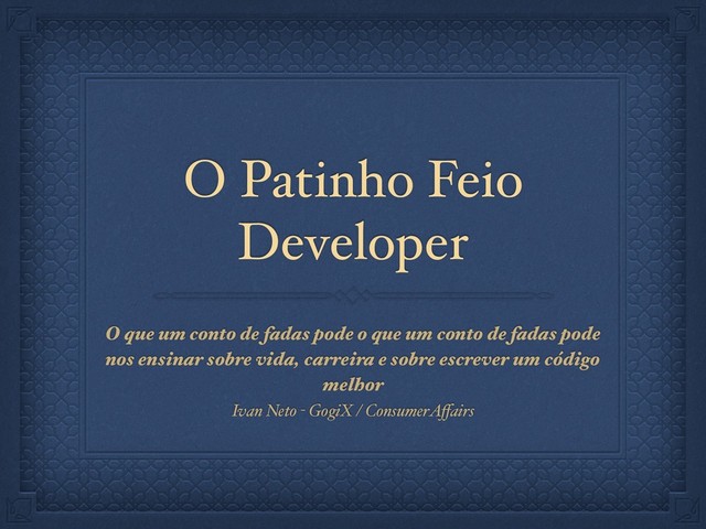 Tentei mostrar através de exemplos e experiência como fazer para evoluir em ambientes adversos, lidar com pessoas, trabalhar em equipe, encontrar oportunidades de crescimento dentro e fora do trabalho, além de dicas sobre como evoluir seu código e habilidades de desenvolvedor mais rapidamente para que esse patinho feio não demore para se tornar um cisne.
