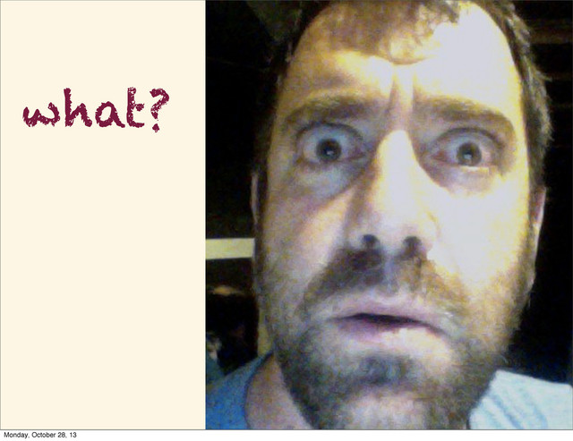• Post large blocks of text to https://gist.github.com • Post multiple related files and a stack trace • Name your files with the proper extension: .rb .yaml .txt • So that syntax highlighting works Monday, October 28, 13