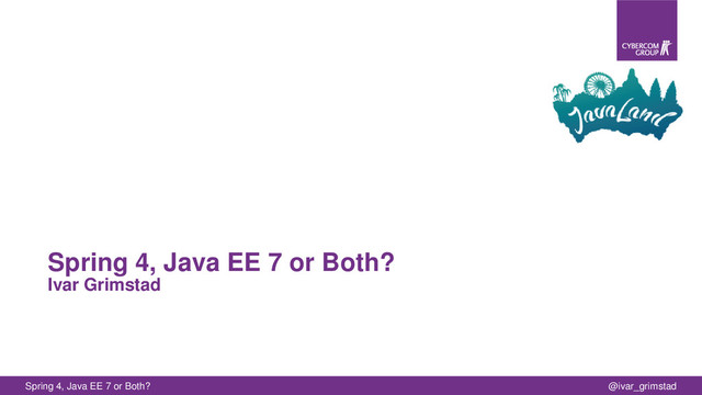 Java EE 7 or Both? @ivar_grimstad @Configuration @ComponentScan("eu.agilejava.both") @ApplicationPath("api") public class ApplicationConfig extends Application { }