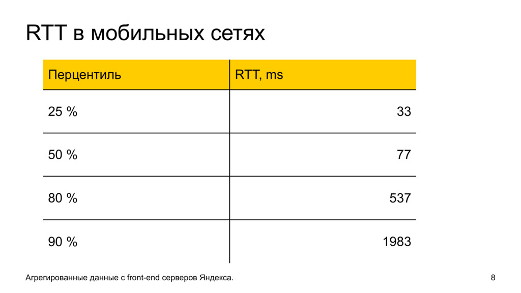 time=651 ms 64 bytes from yandex.ru (5.255.255.70): icmp_seq=2 ttl=52 time=512 ms … 64 bytes from yandex.ru (5.255.255.70): icmp_seq=12 ttl=52 time=6506 ms 64 bytes from yandex.ru (5.255.255.70): icmp_seq=13 ttl=52 time=5506 ms … 64 bytes from yandex.ru (5.255.255.70): icmp_seq=20 ttl=52 time=626 ms RTT зависит от загруженности канала RTT в мобильной 2G-сети до и во время загрузки страницы. 10