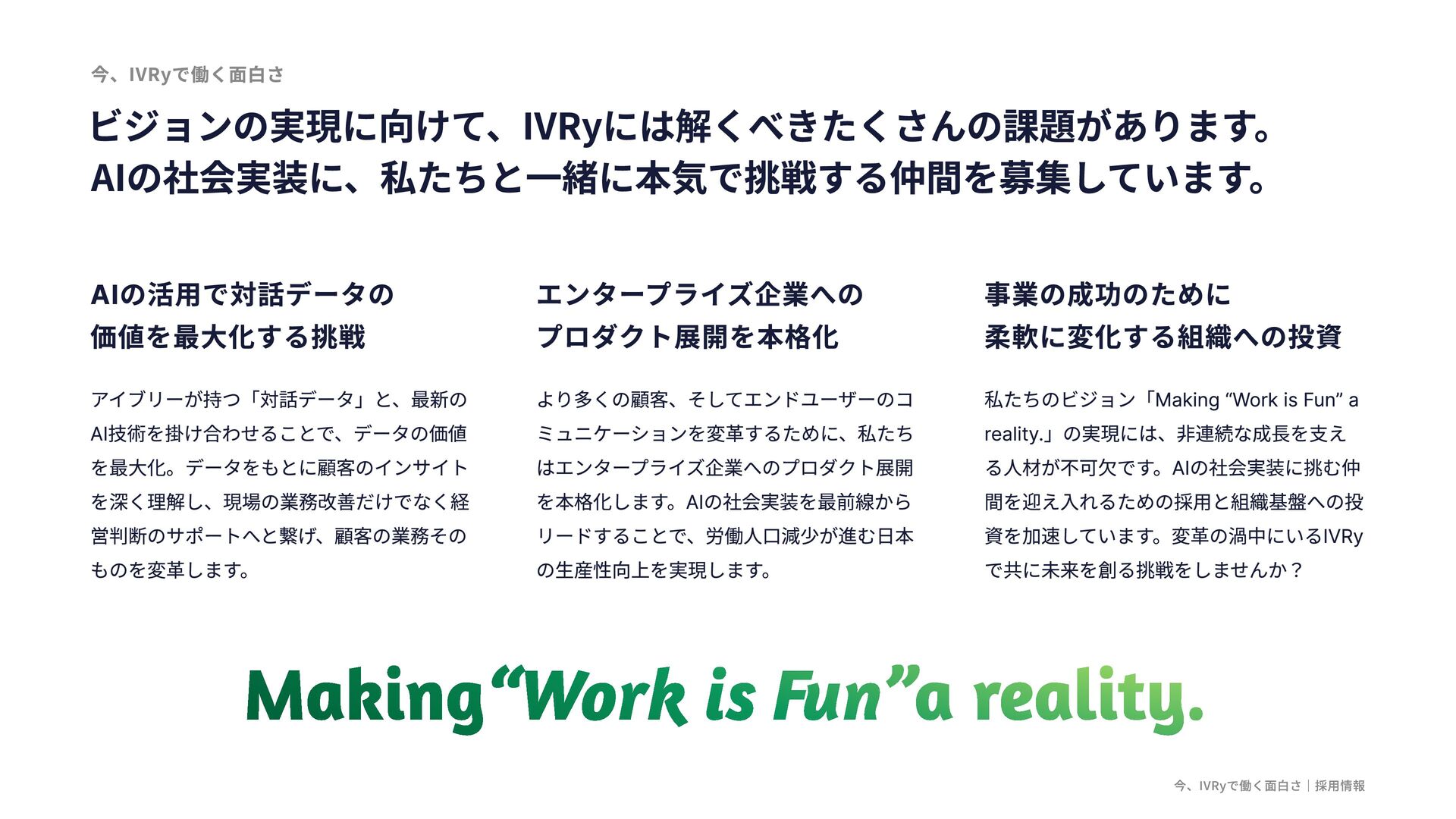 NEW! 業務データと連携した音声対話 検索・通知 Analytics / BI CRM AI / ML Platform AI Agent IVRy Data Hub IVRy Data Sharing 音声対話・文字起こし・FAX クライアント内外のデータ IVRyの非構造化データ Data Platform 非構造化データ メール チャット 社内ドキュメント (Word/PDF/画像 等) 業務 アプリケーション CRM