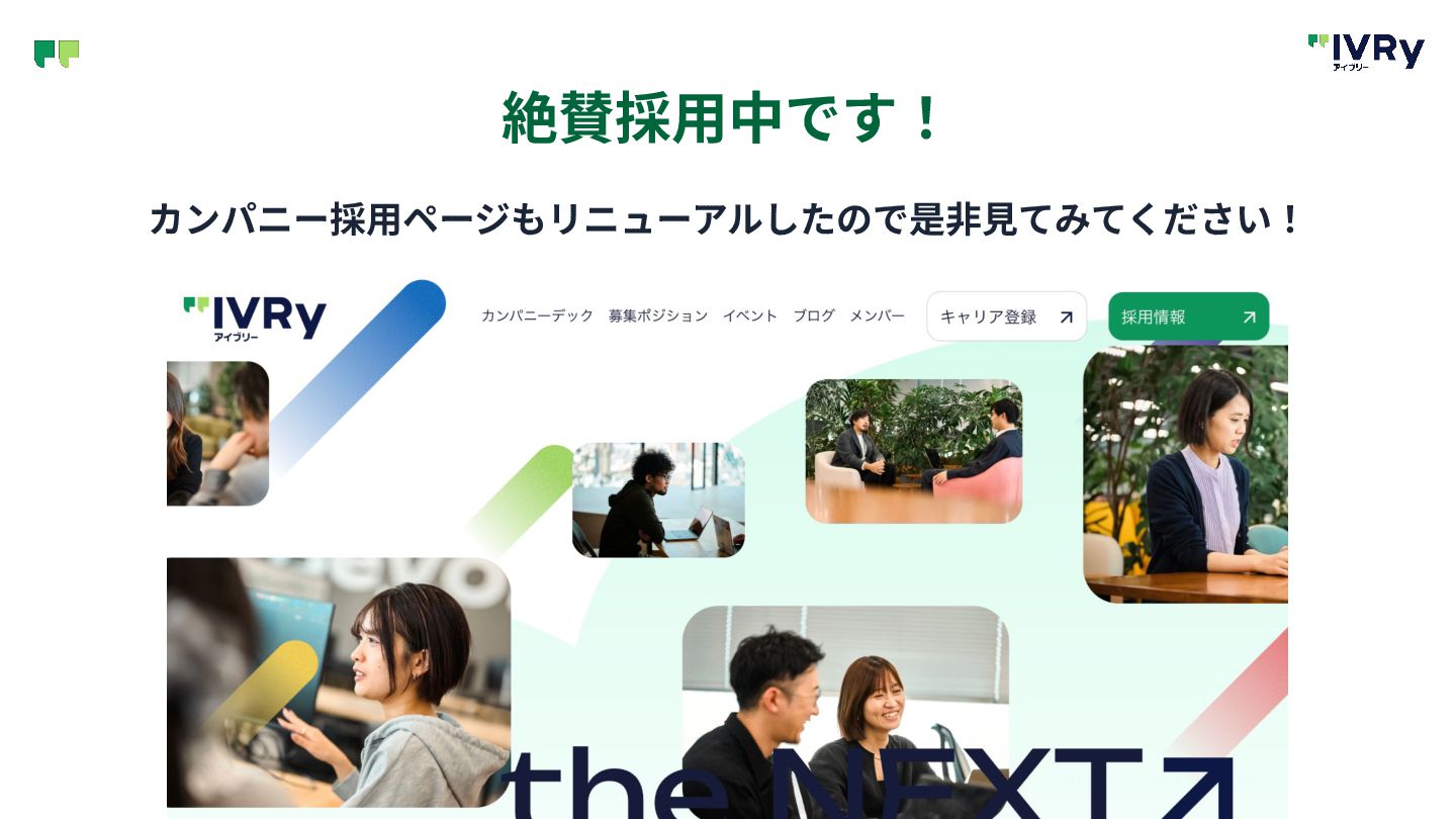 ■リンク集 ・コーポレートサイト:https://ivry.jp/company/ ・採用ページ:https://ivry-jp.notion.site/ ・イベント一覧:https://ivry.connpass.com/event/ ・IVRy Tech(Xアカウント):https://x.com/IVRy_tech