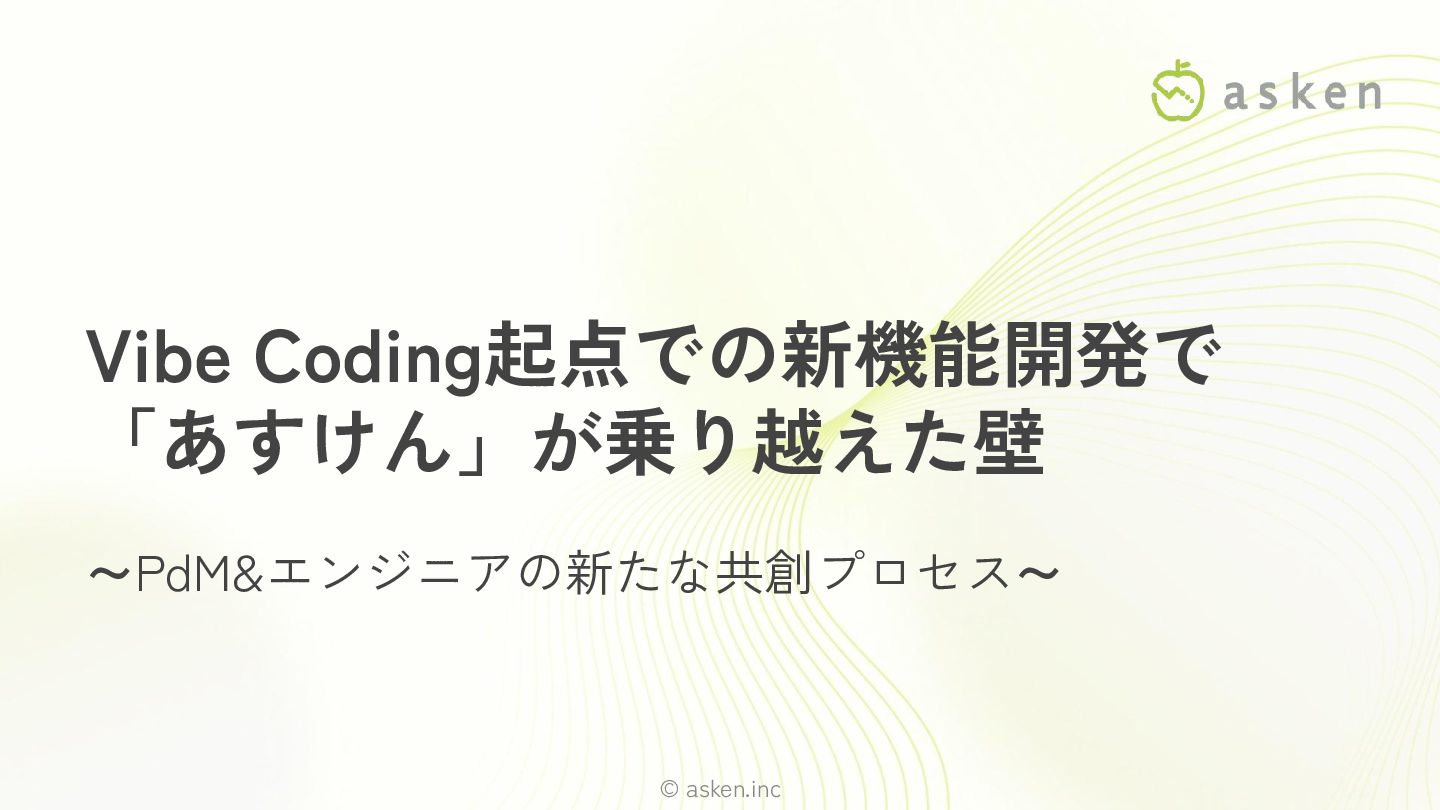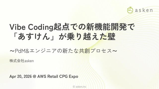 © asken.inc Vibe Coding起点での新機能開発で 「あすけん」が乗り越えた壁 ~PdM&エンジニアの新たな共創プロセス~ Apr 20, 2026 @