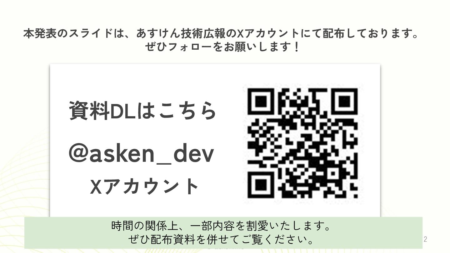 © asken.inc 本発表のスライドは、あすけん技術広報のXアカウントにて配布しております。 ぜひフォローをお願いします! 資料DLはこちら @asken_dev Xアカウント 2 時間の関係上、一部内容を割愛いたします。 ぜひ配布資料を併せてご覧ください。