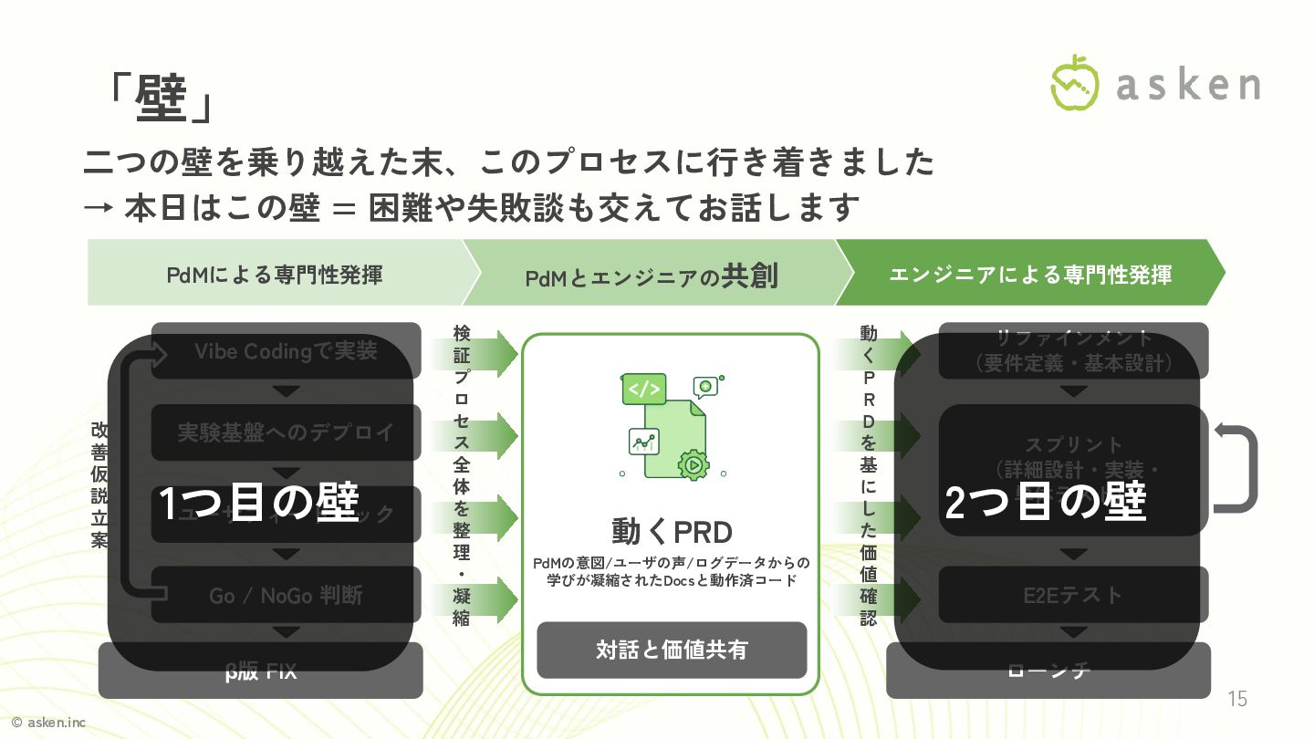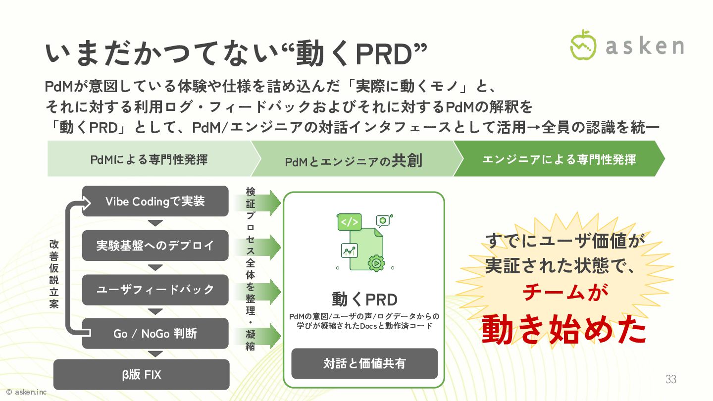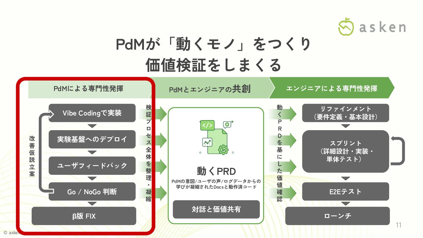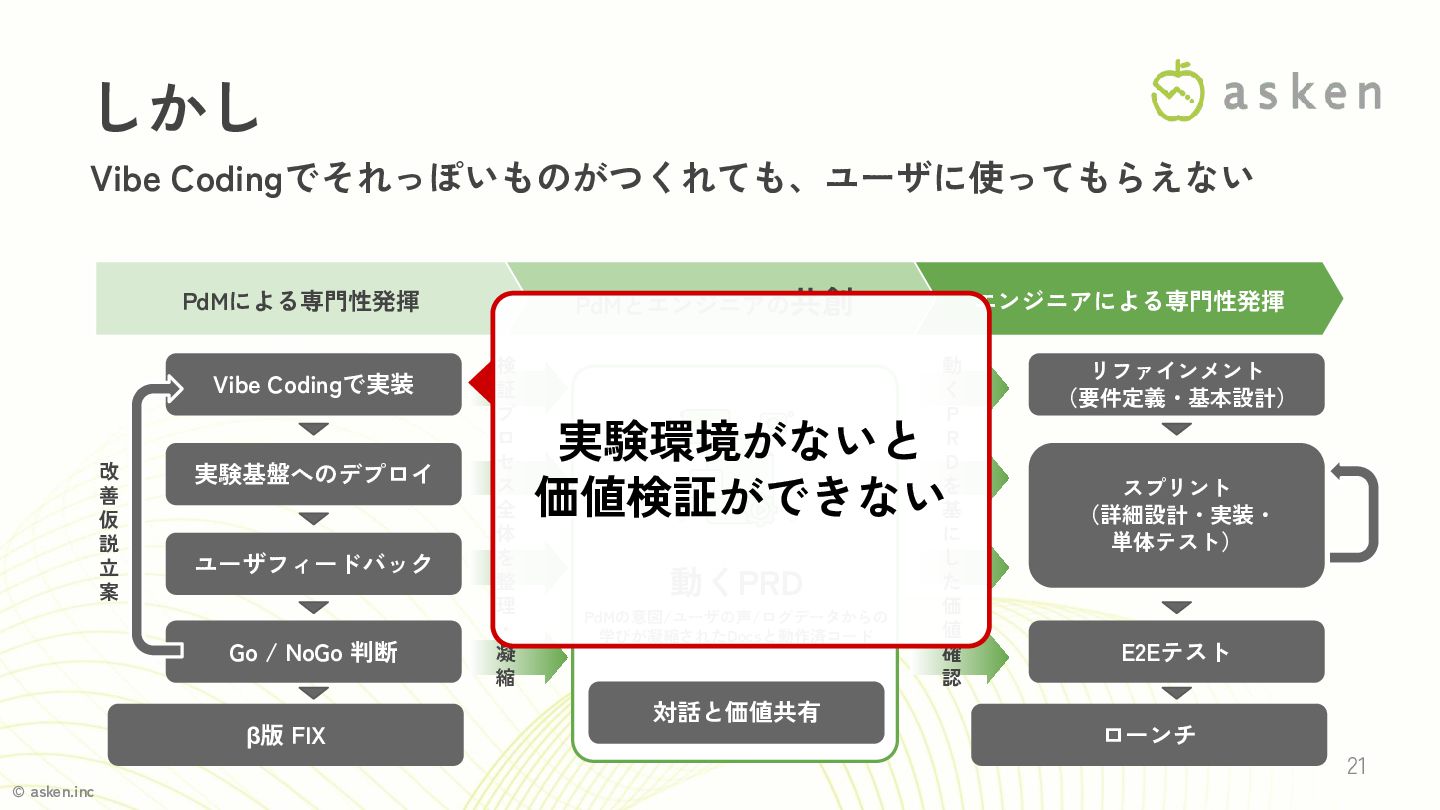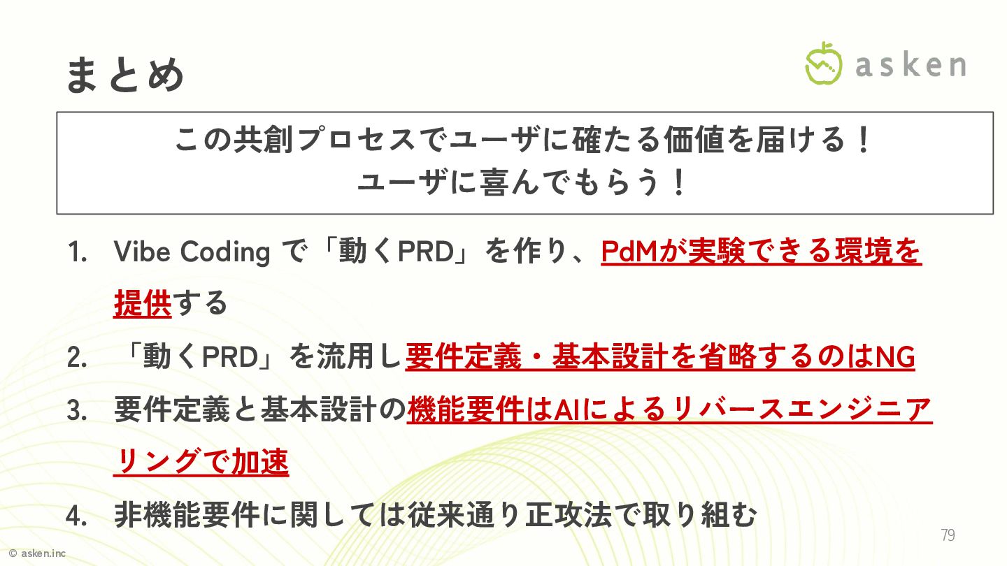 © asken.inc 1. Vibe Coding で「動くPRD」を作り、PdMが実験できる環境を 提供する 2. 「動くPRD」を流用し要件定義・基本設計を省略するのはNG 3.