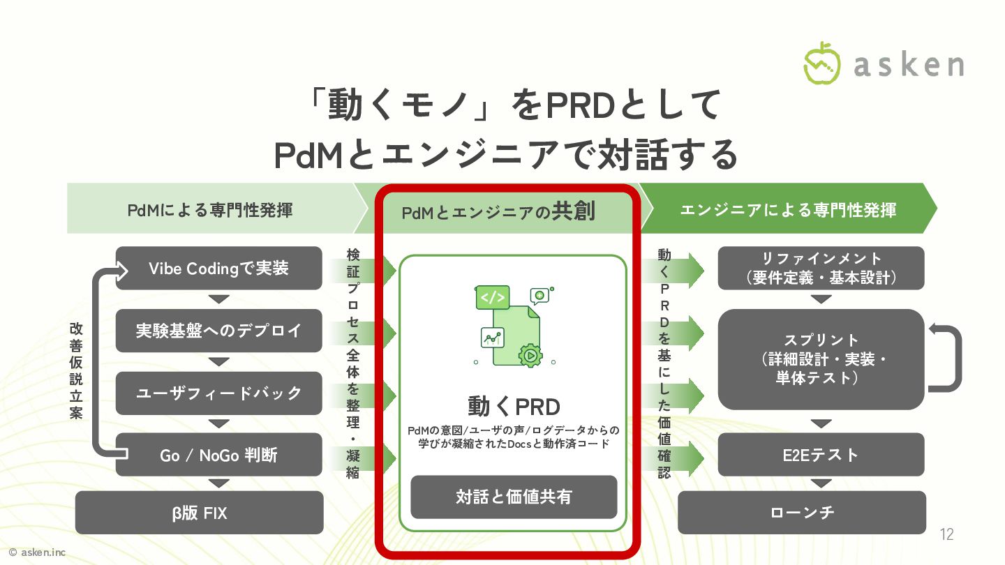 Vibe Codingで実装 実験基盤へのデプロイ ユーザフィードバック Go / NoGo 判断 β版 FIX 動くPRD PdMの意図/ユーザの声/ログデータからの 学びが凝縮されたDocsと動作済コード 対話と価値共有 リファインメント (要件定義・基本設計) スプリント (詳細設計・実装・ 単体テスト) E2Eテスト ローンチ 動 く P R D を 基 に し た 価 値 確 認 検 証 プ ロ セ ス 全 体 を 整 理 ・ 凝 縮 PdMとエンジニアの共創 11 PdMが「動くモノ」をつくり 価値検証をしまくる