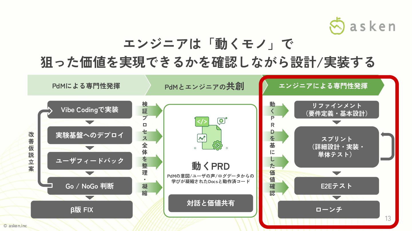 Vibe Codingで実装 実験基盤へのデプロイ ユーザフィードバック Go / NoGo 判断 β版 FIX 動くPRD PdMの意図/ユーザの声/ログデータからの 学びが凝縮されたDocsと動作済コード 対話と価値共有 リファインメント (要件定義・基本設計) スプリント (詳細設計・実装・ 単体テスト) E2Eテスト ローンチ 動 く P R D を 基 に し た 価 値 確 認 検 証 プ ロ セ ス 全 体 を 整 理 ・ 凝 縮 PdMとエンジニアの共創 12 「動くモノ」をPRDとして PdMとエンジニアで対話する