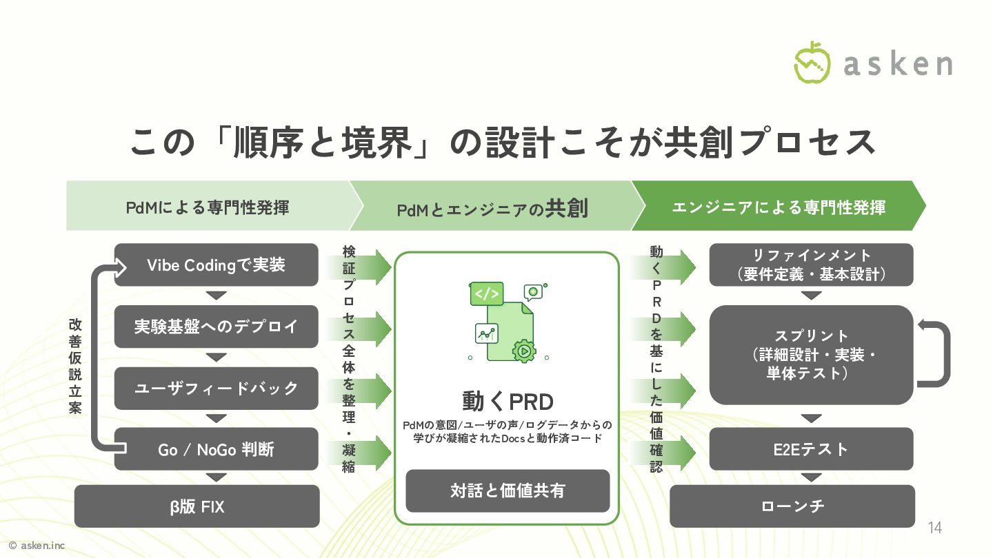 Vibe Codingで実装 実験基盤へのデプロイ ユーザフィードバック Go / NoGo 判断 β版 FIX 動くPRD PdMの意図/ユーザの声/ログデータからの 学びが凝縮されたDocsと動作済コード 対話と価値共有 リファインメント (要件定義・基本設計) スプリント (詳細設計・実装・ 単体テスト) E2Eテスト ローンチ 動 く P R D を 基 に し た 価 値 確 認 検 証 プ ロ セ ス 全 体 を 整 理 ・ 凝 縮 PdMとエンジニアの共創 13 エンジニアは「動くモノ」で 狙った価値を実現できるかを確認しながら設計/実装する