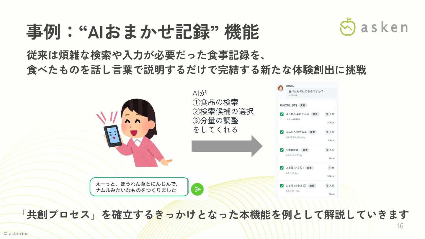 © asken.inc 事例:“AIおまかせ記録” 機能 16 従来は煩雑な検索や入力が必要だった食事記録を、 食べたものを話し言葉で説明するだけで完結する新たな体験創出に挑戦 「共創プロセス」を確立するきっかけとなった本機能を例として解説していきます AIが ①食品の検索