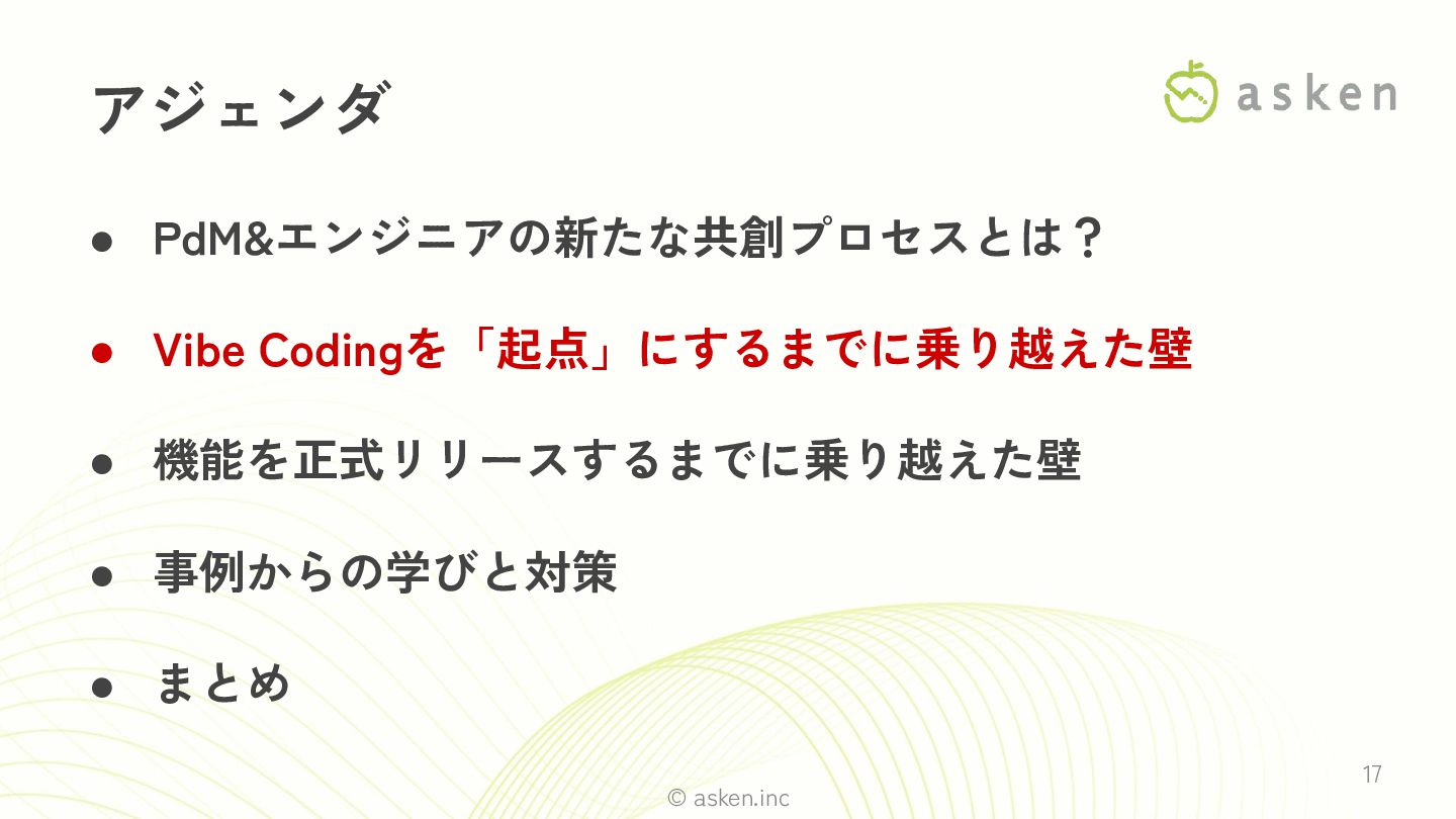© asken.inc 17 • PdM&エンジニアの新たな共創プロセスとは? • Vibe Codingを「起点」にするまでに乗り越えた壁 • 機能を正式リリースするまでに乗り越えた壁