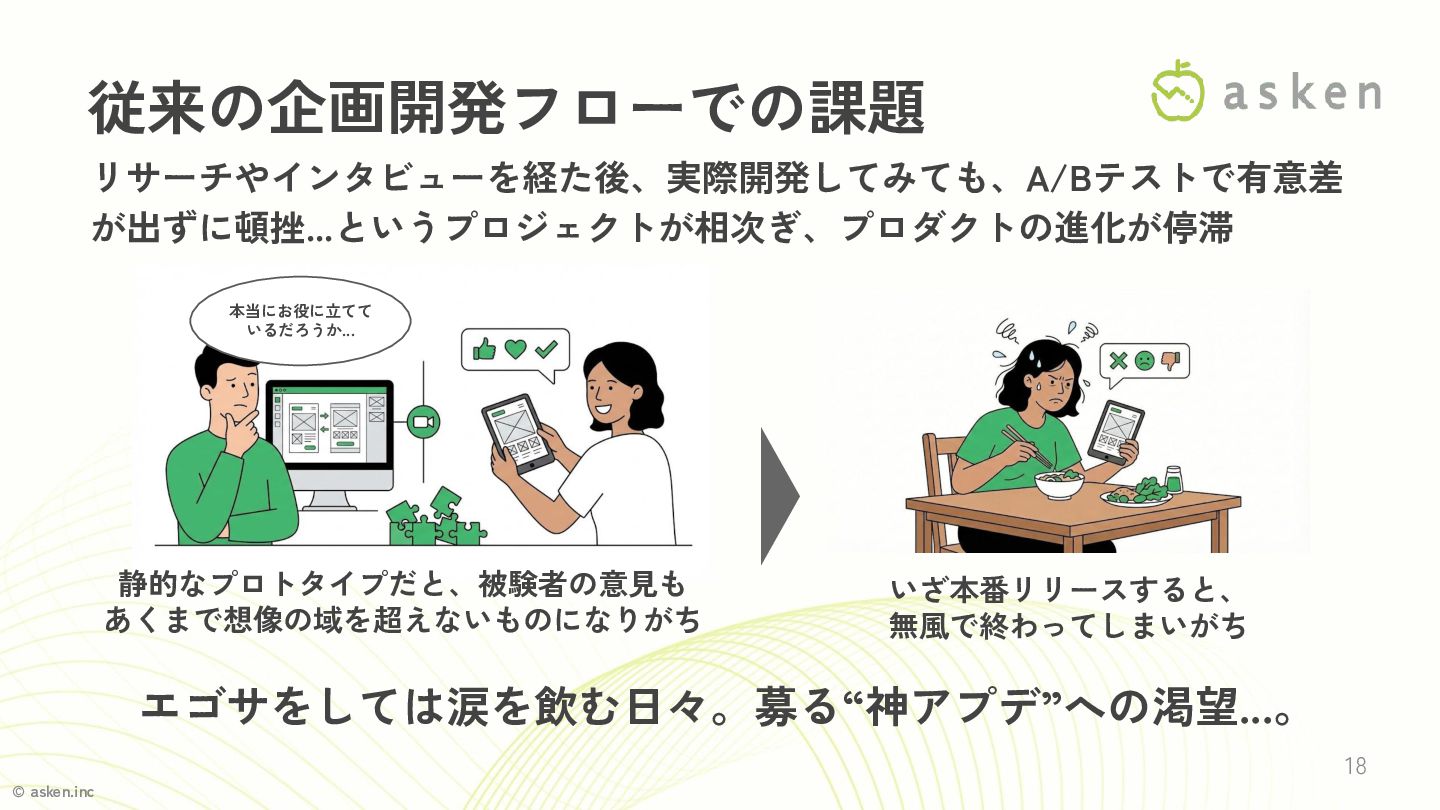 © asken.inc 18 従来の企画開発フローでの課題 リサーチやインタビューを経た後、実際開発してみても、A/Bテストで有意差 が出ずに頓挫...というプロジェクトが相次ぎ、プロダクトの進化が停滞 エゴサをしては涙を飲む日々。募る“神アプデ”への渇望...。 静的なプロトタイプだと、被験者の意見も あくまで想像の域を超えないものになりがち いざ本番リリースすると、