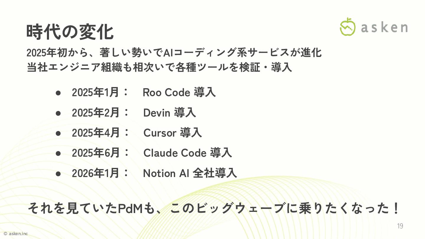 導入 • 2025年2月: Devin 導入 • 2025年4月: Cursor 導入 • 2025年6月: Claude Code 導入 • 2026年1月: Notion AI 全社導入