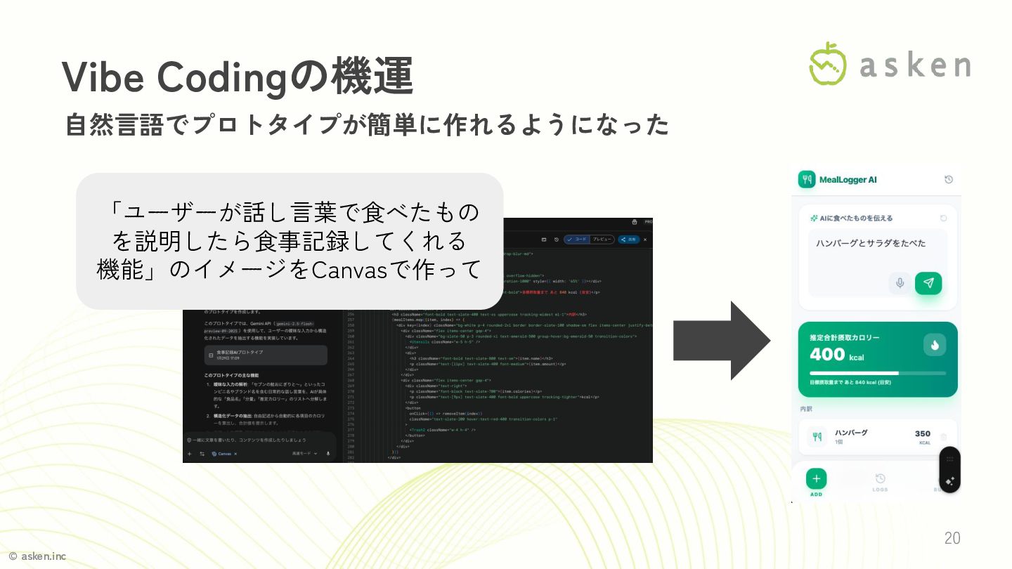© asken.inc 20 Vibe Codingの機運 自然言語でプロトタイプが簡単に作れるようになった 「ユーザーが話し言葉で食べたもの を説明したら食事記録してくれる 機能」のイメージをCanvasで作って
