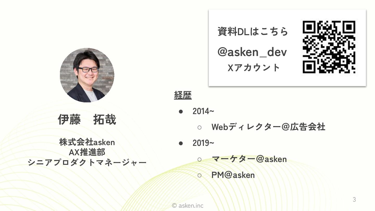 ◦ Webディレクター@広告会社 • 2019~ ◦ マーケター@asken ◦ PM@asken 資料DLはこちら @asken_dev Xアカウント