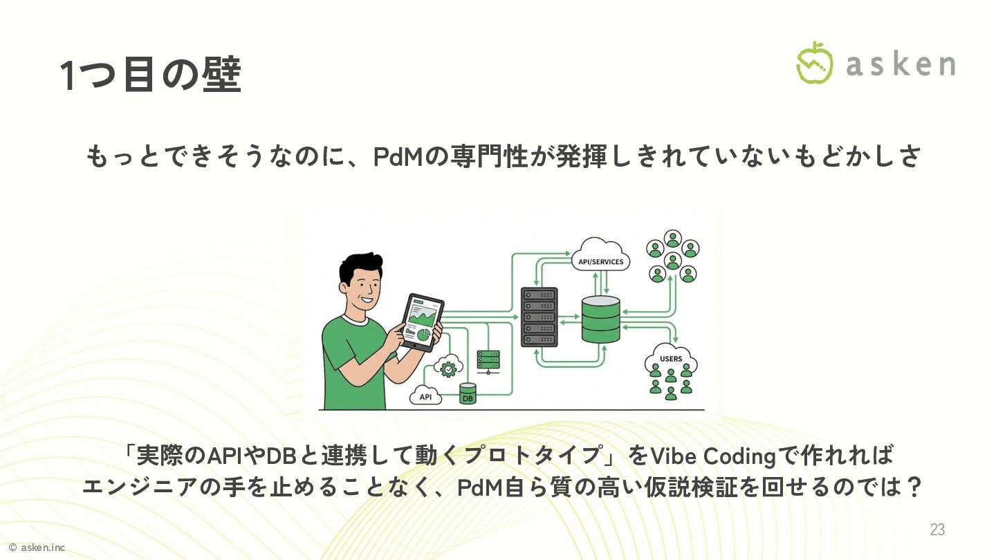 © asken.inc 23 1つ目の壁 もっとできそうなのに、PdMの専門性が発揮しきれていないもどかしさ 「実際のAPIやDBと連携して動くプロトタイプ」をVibe Codingで作れれば エンジニアの手を止めることなく、PdM自ら質の高い仮説検証を回せるのでは?