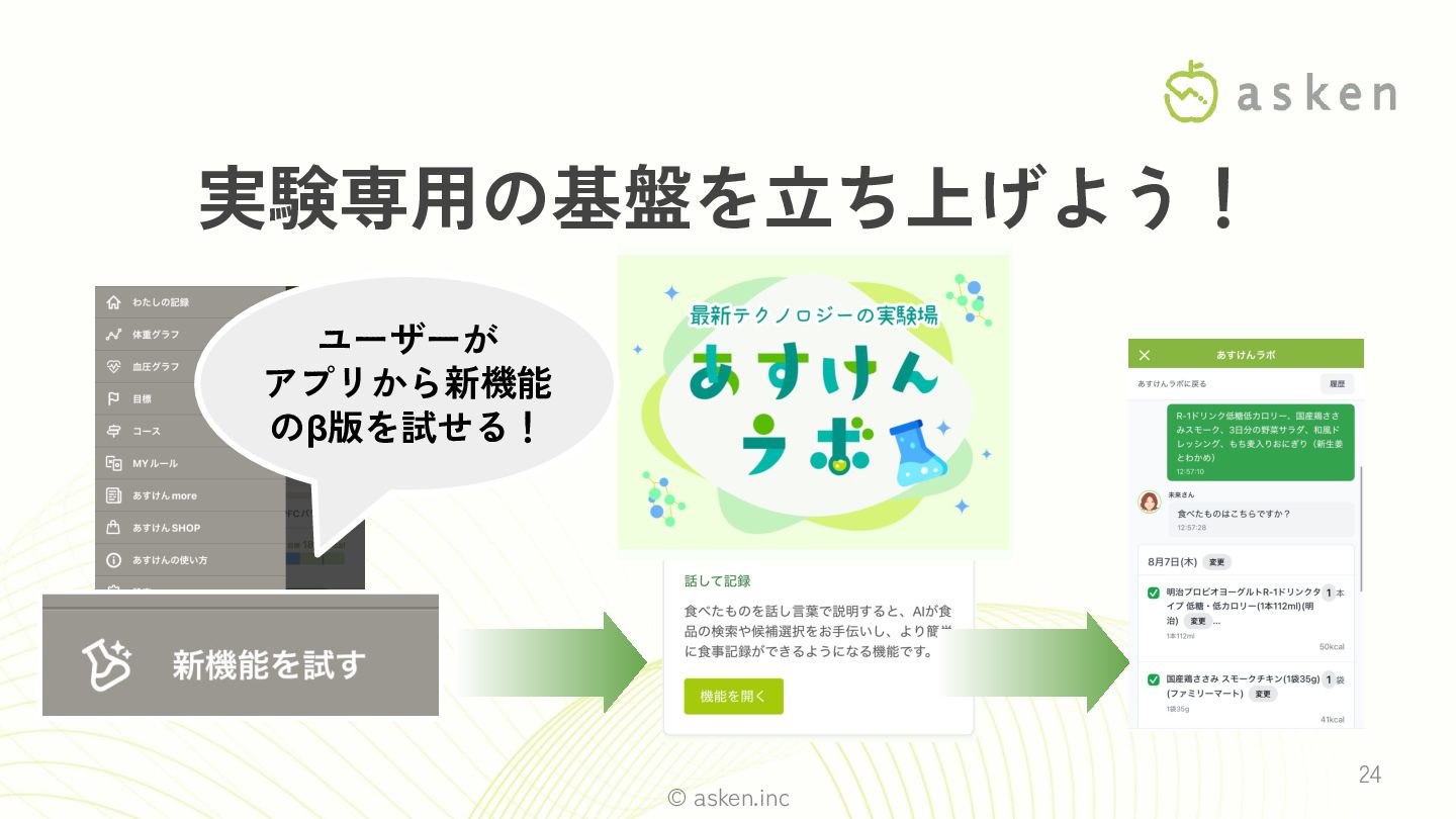 © asken.inc 24 実験専用の基盤を立ち上げよう! ユーザーが アプリから新機能 のβ版を試せる!
