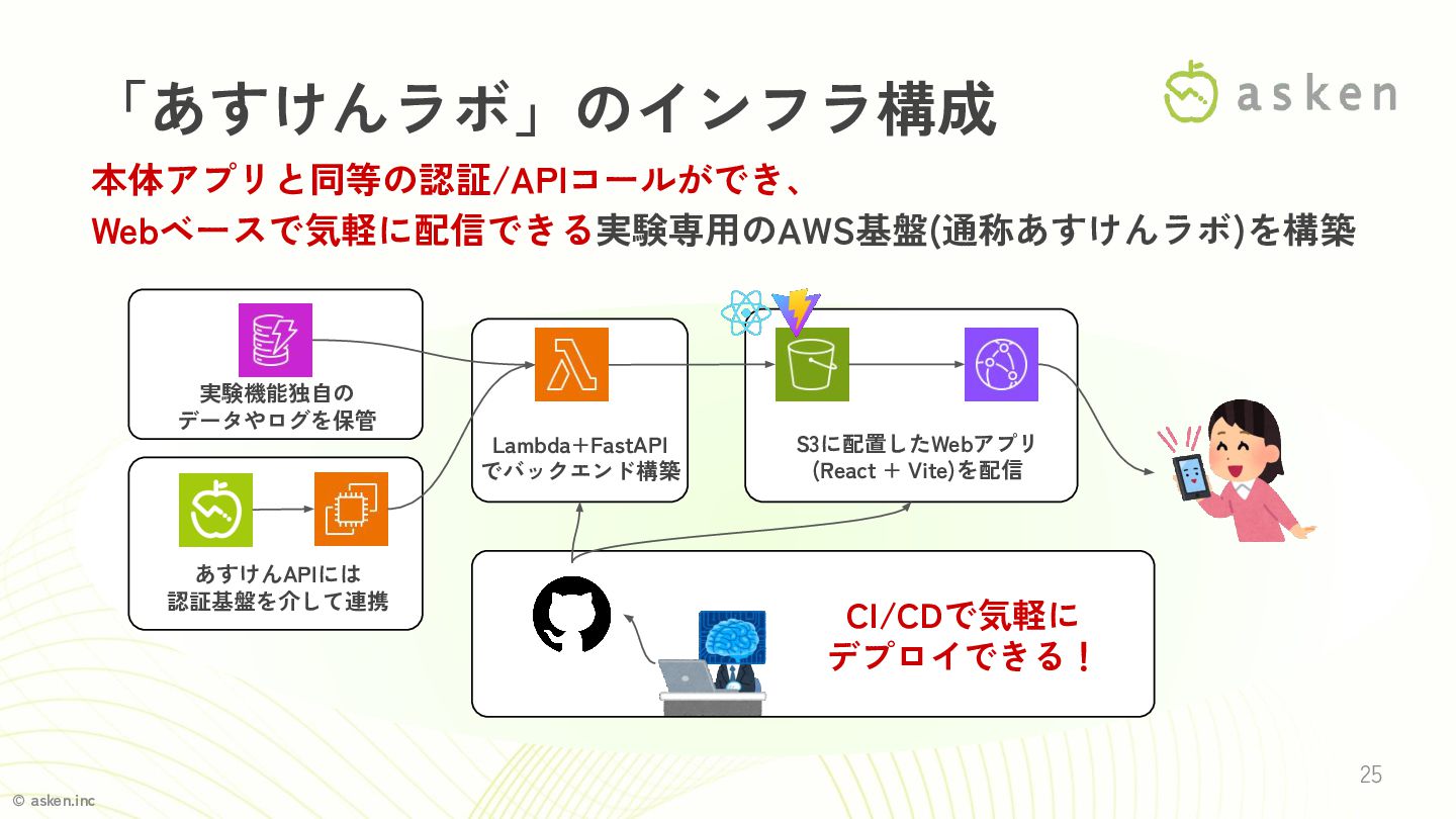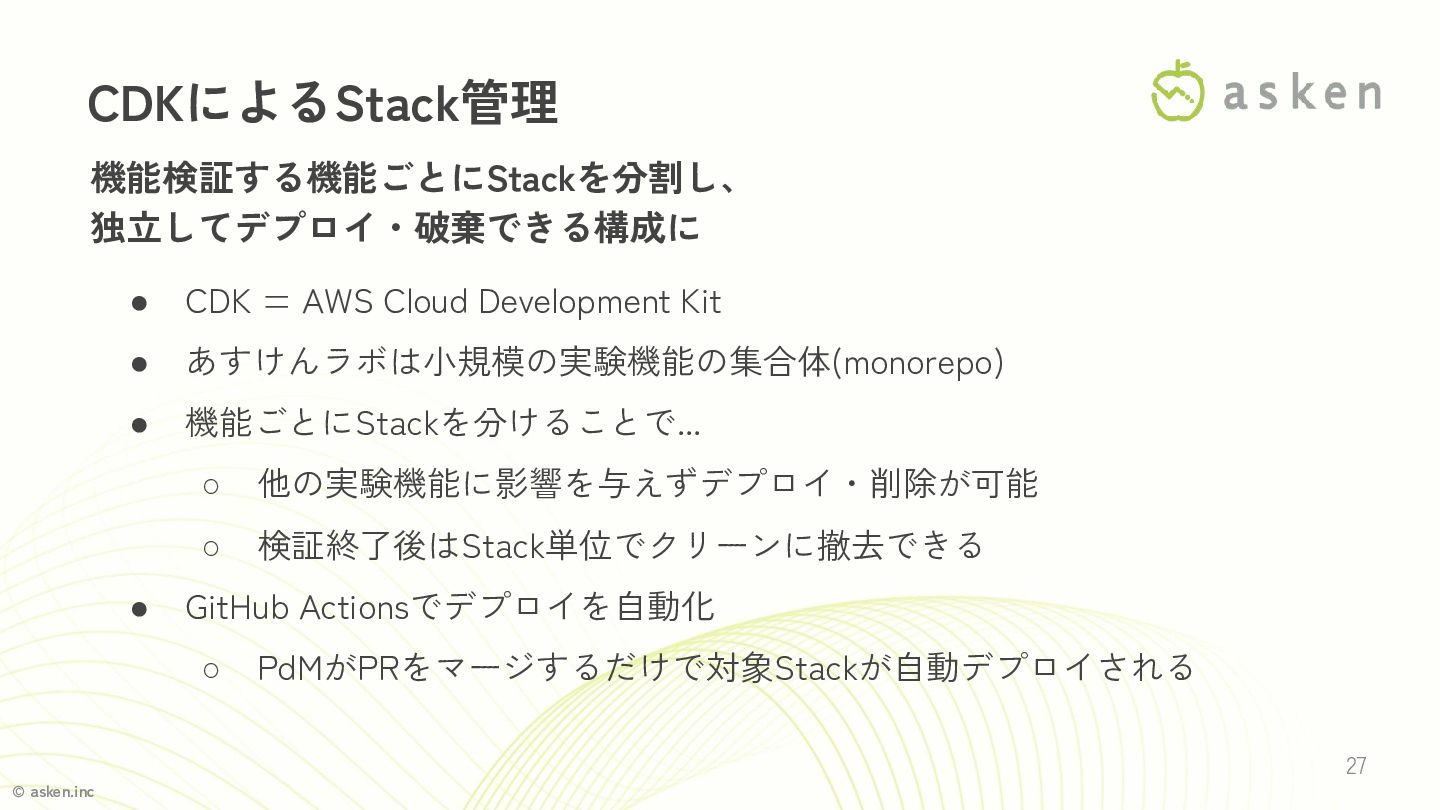 Cloud Development Kit • あすけんラボは小規模の実験機能の集合体(monorepo) • 機能ごとにStackを分けることで... ◦ 他の実験機能に影響を与えずデプロイ・削除が可能 ◦ 検証終了後はStack単位でクリーンに撤去できる • GitHub Actionsでデプロイを自動化 ◦ PdMがPRをマージするだけで対象Stackが自動デプロイされる
