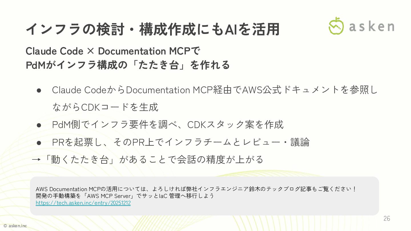 • Claude CodeからDocumentation MCP経由でAWS公式ドキュメントを参照し ながらCDKコードを生成 • PdM側でインフラ要件を調べ、CDKスタック案を作成 • PRを起票し、そのPR上でインフラチームとレビュー・議論 →「動くたたき台」があることで会話の精度が上がる AWS Documentation MCPの活用については、よろしければ弊社インフラエンジニア鈴木のテックブログ記事もご覧ください! 開発の手動構築を「AWS MCP Server」でサッとIaC 管理へ移行しよう https://tech.asken.inc/entry/20251212