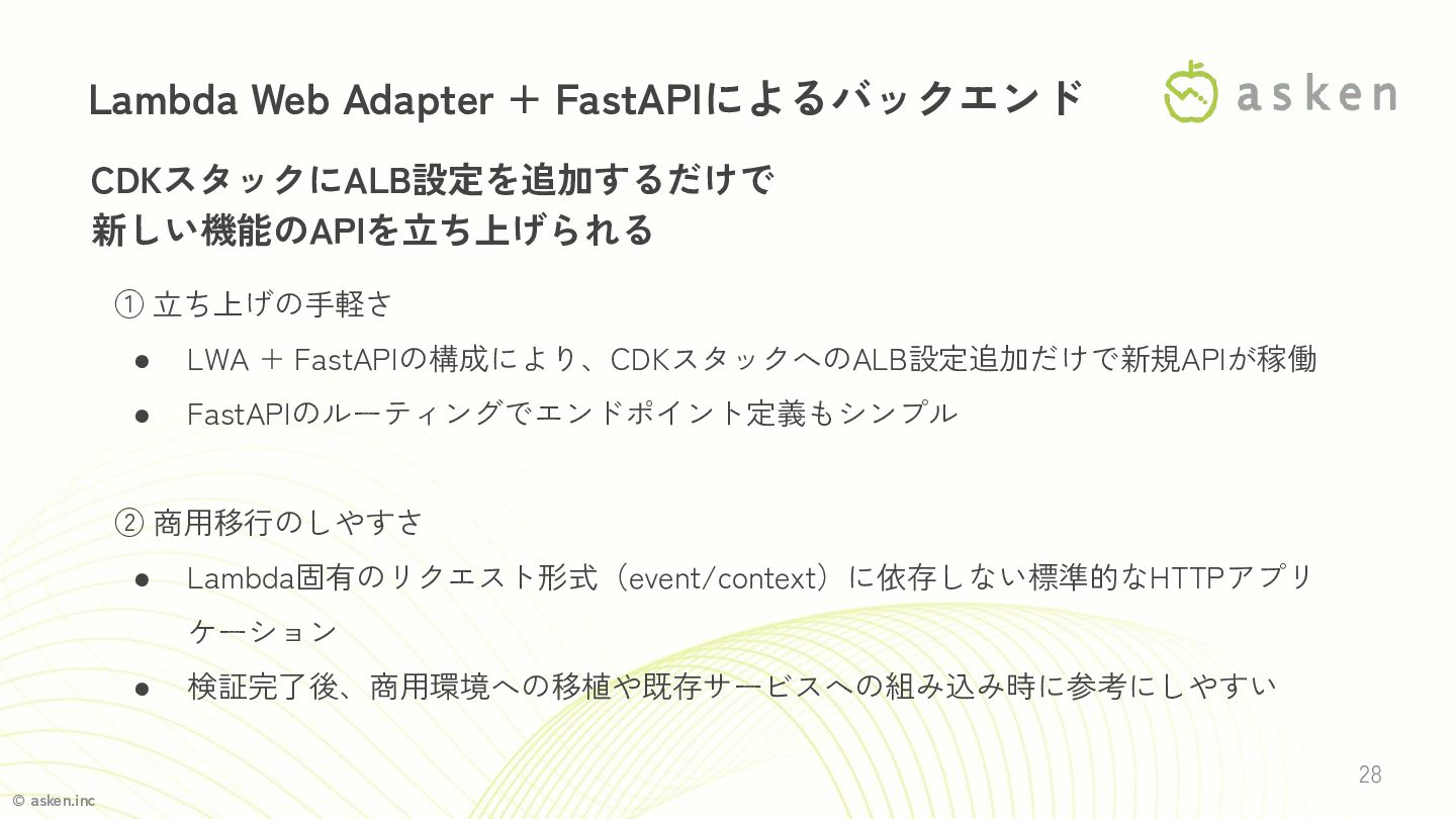 © asken.inc 28 Lambda Web Adapter + FastAPIによるバックエンド CDKスタックにALB設定を追加するだけで 新しい機能のAPIを立ち上げられる