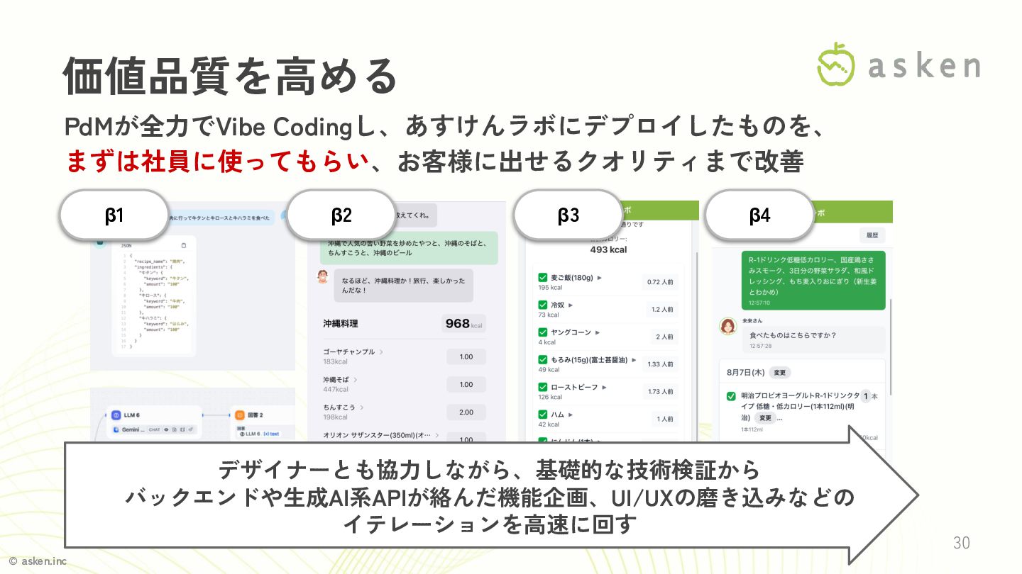 © asken.inc 30 価値品質を高める PdMが全力でVibe Codingし、あすけんラボにデプロイしたものを、 まずは社員に使ってもらい、お客様に出せるクオリティまで改善 デザイナーとも協力しながら、基礎的な技術検証から バックエンドや生成AI系APIが絡んだ機能企画、UI/UXの磨き込みなどの イテレーションを高速に回す