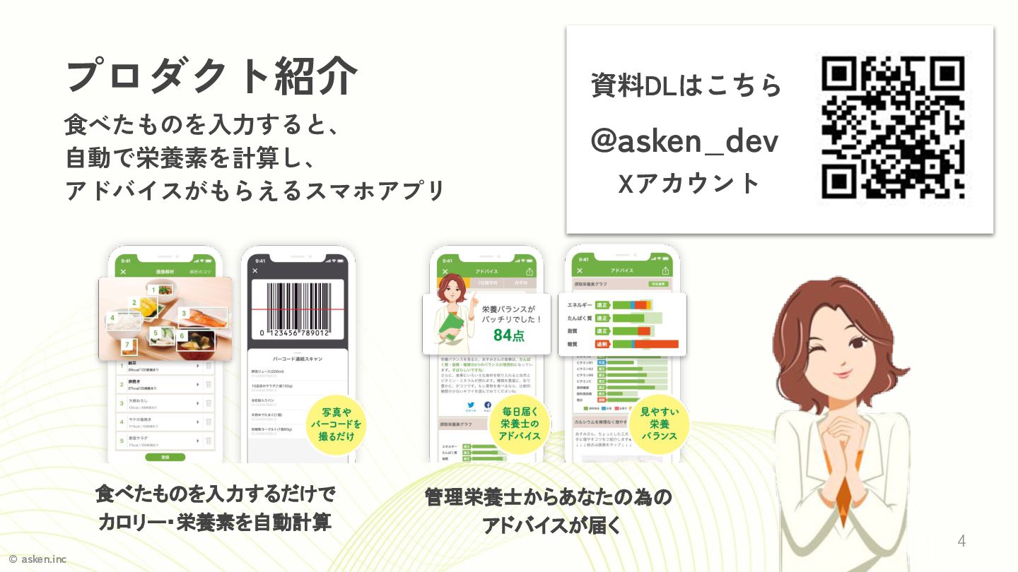 アドバイスがもらえるスマホアプリ 資料DLはこちら @asken_dev Xアカウント