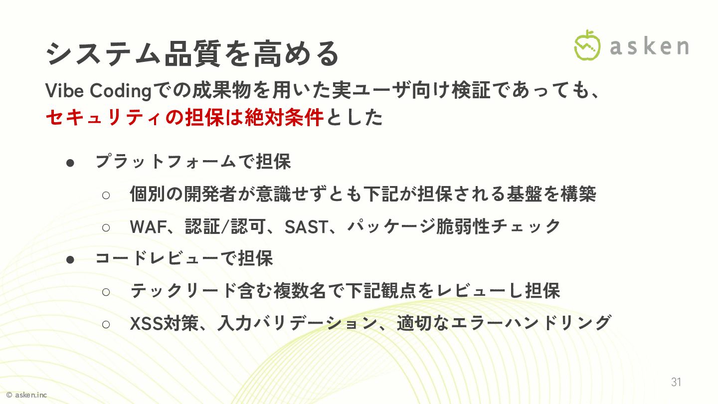 © asken.inc 31 システム品質を高める Vibe Codingでの成果物を用いた実ユーザ向け検証であっても、 セキュリティの担保は絶対条件とした • プラットフォームで担保 ◦