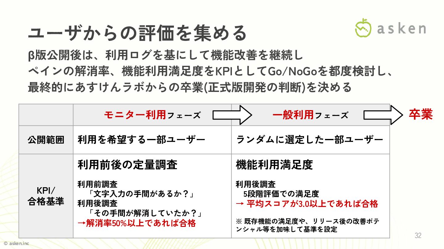 © asken.inc 32 ユーザからの評価を集める β版公開後は、利用ログを基にして機能改善を継続し ペインの解消率、機能利用満足度をKPIとしてGo/NoGoを都度検討し、 最終的にあすけんラボからの卒業(正式版開発の判断)を決める モニター利用フェーズ 一般利用フェーズ 公開範囲