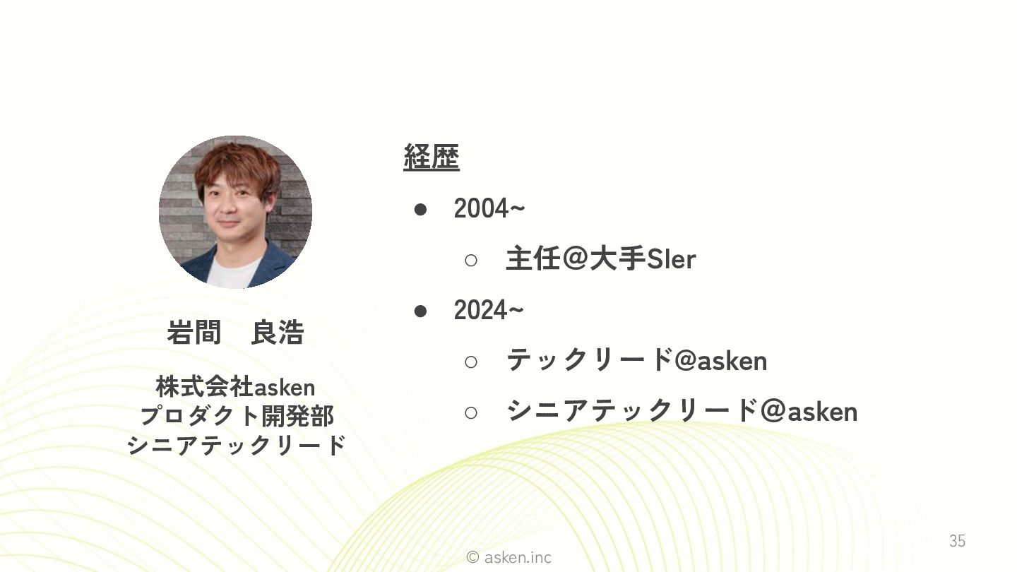 © asken.inc 岩間 良浩 株式会社asken プロダクト開発部 シニアテックリード 35 経歴 • 2004~