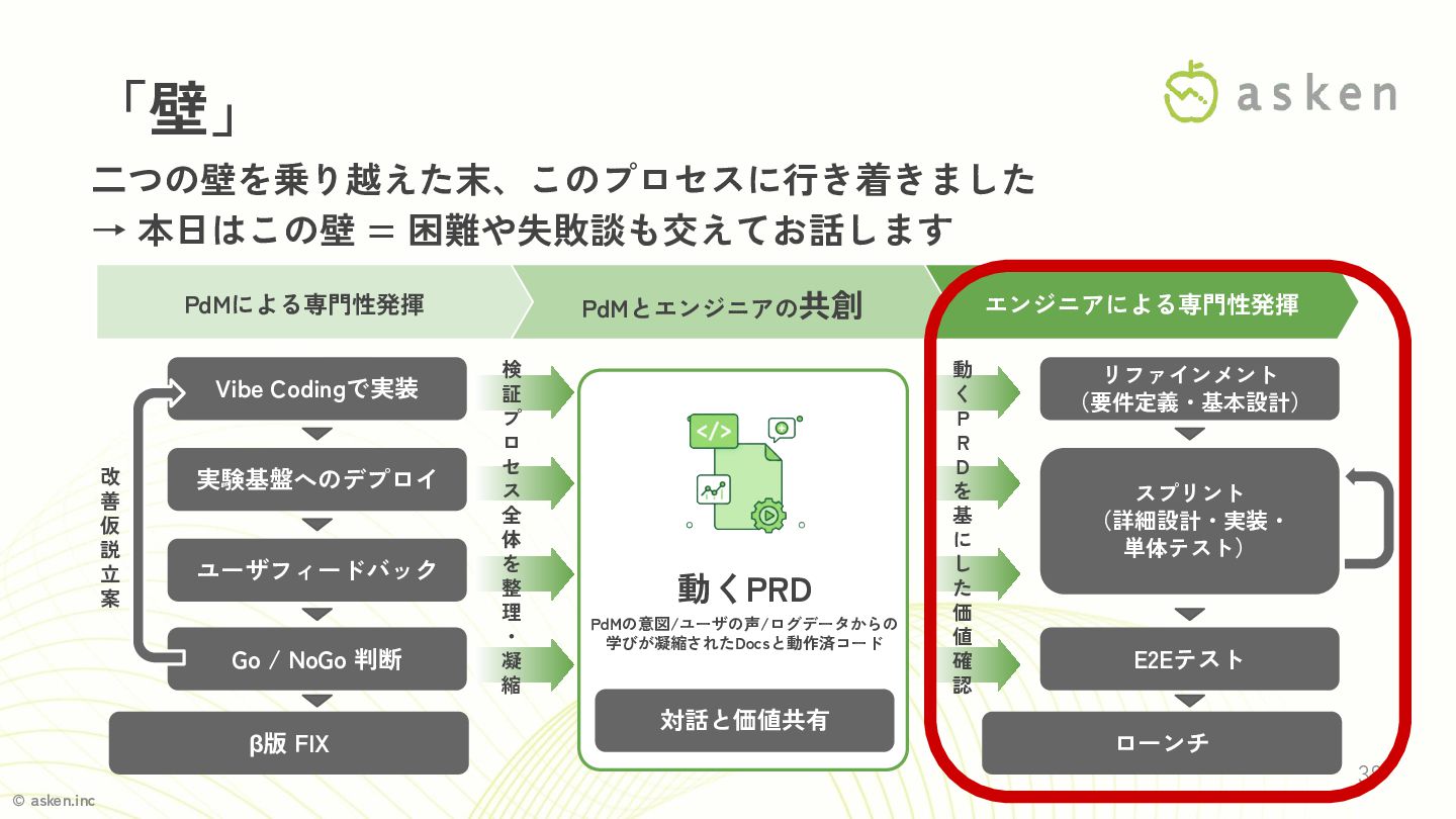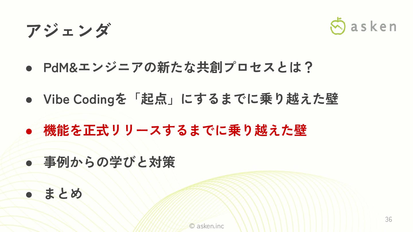 © asken.inc 36 • PdM&エンジニアの新たな共創プロセスとは? • Vibe Codingを「起点」にするまでに乗り越えた壁 • 機能を正式リリースするまでに乗り越えた壁