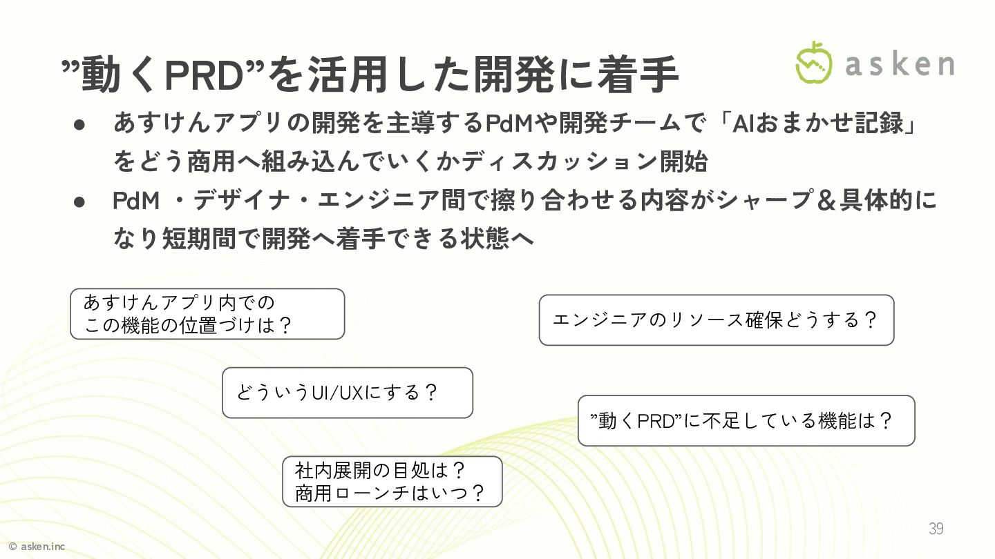 © asken.inc • あすけんアプリの開発を主導するPdMや開発チームで「AIおまかせ記録」 をどう商用へ組み込んでいくかディスカッション開始 • PdM ・デザイナ・エンジニア間で擦り合わせる内容がシャープ&具体的に なり短期間で開発へ着手できる状態へ 39