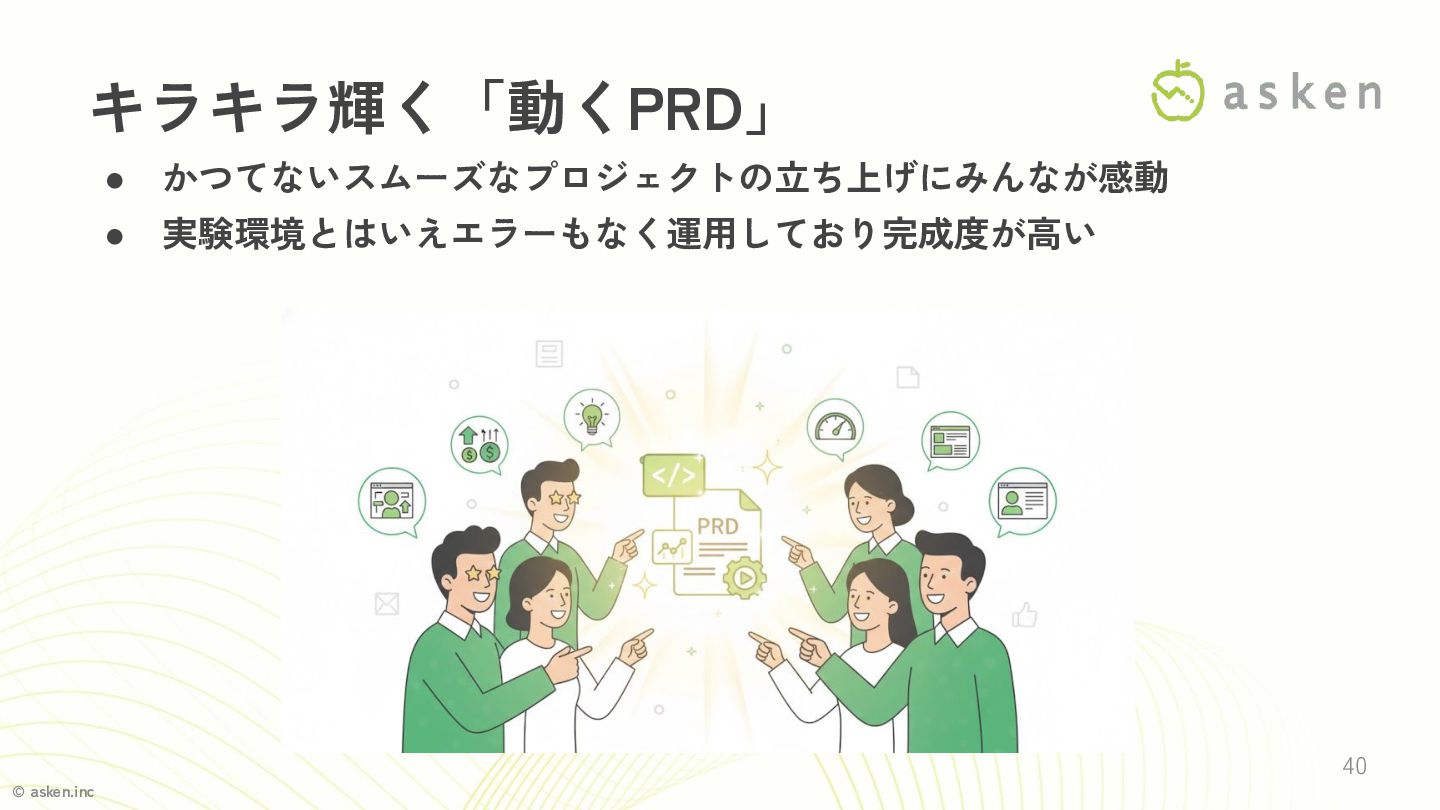 © asken.inc • かつてないスムーズなプロジェクトの立ち上げにみんなが感動 • 実験環境とはいえエラーもなく運用しており完成度が高い 40 キラキラ輝く「動くPRD」
