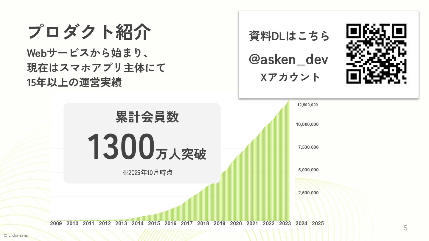 © asken.inc Webサービスから始まり、 現在はスマホアプリ主体にて 15年以上の運営実績 5 プロダクト紹介 累計会員数 1300万人突破 ※2025年10月時点