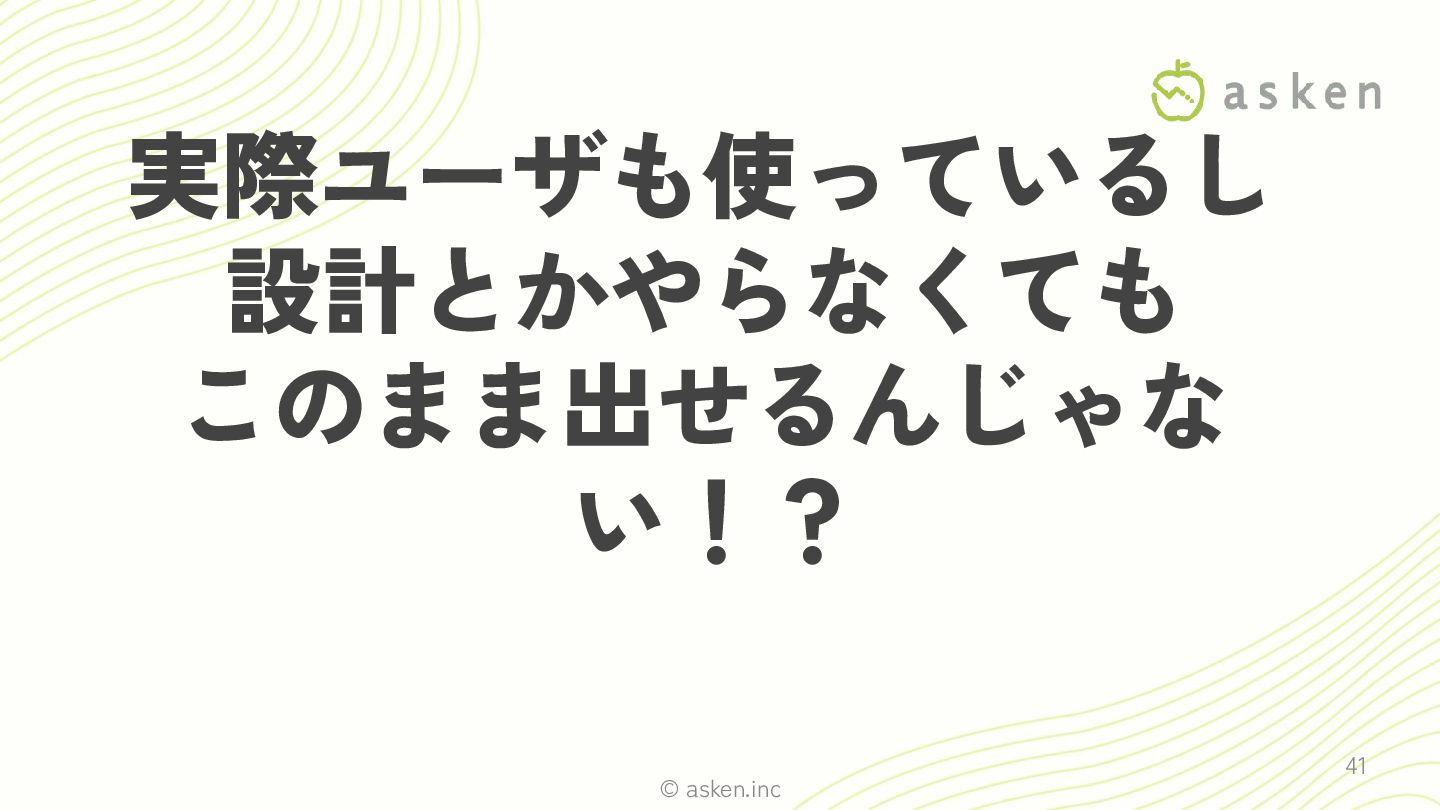 © asken.inc 実際ユーザも使っているし 設計とかやらなくても このまま出せるんじゃな い!? 41
