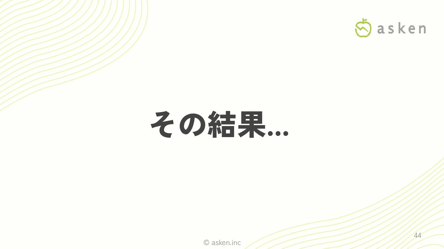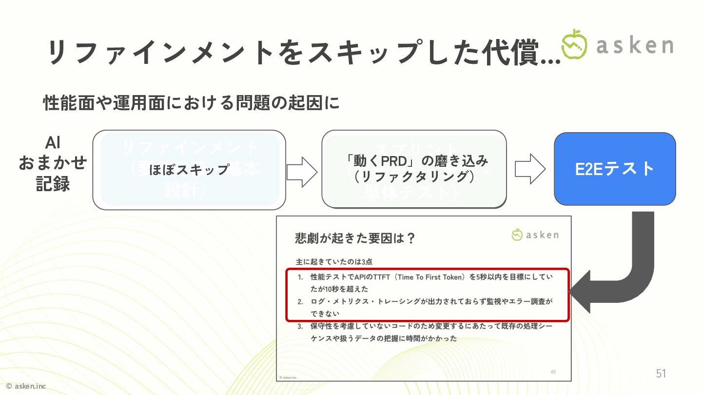 © asken.inc 51 リファインメントをスキップした代償... 性能面や運用面における問題の起因に AI おまかせ 記録 E2Eテスト リファインメント