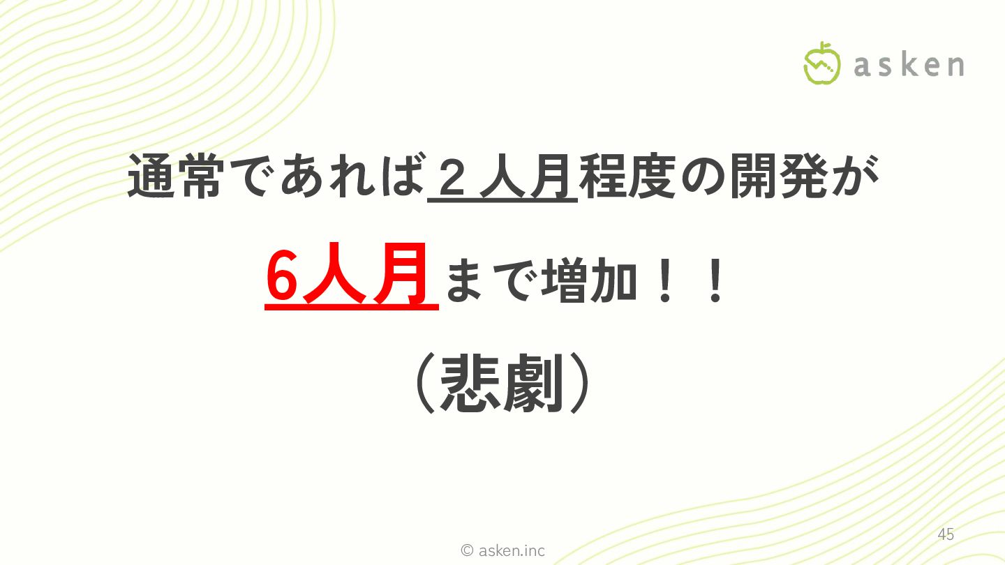 © asken.inc 通常であれば2人月程度の開発が 6人月まで増加!! (悲劇) 45
