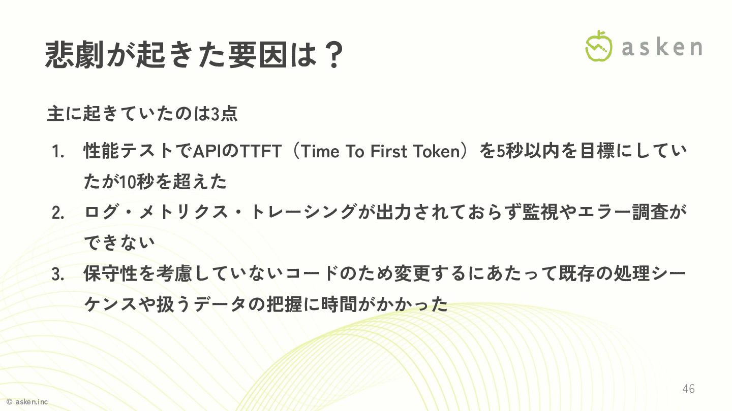 © asken.inc 主に起きていたのは3点 1. 性能テストでAPIのTTFT(Time To First Token)を5秒以内を目標にしてい たが10秒を超えた 2.