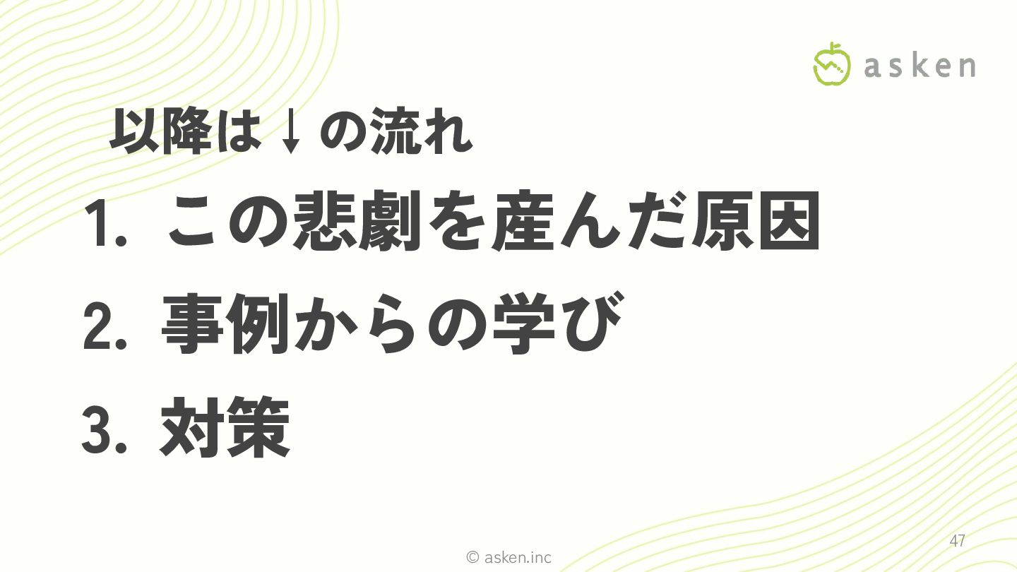 © asken.inc 47 以降は↓の流れ 1. この悲劇を産んだ原因 2. 事例からの学び 3. 対策
