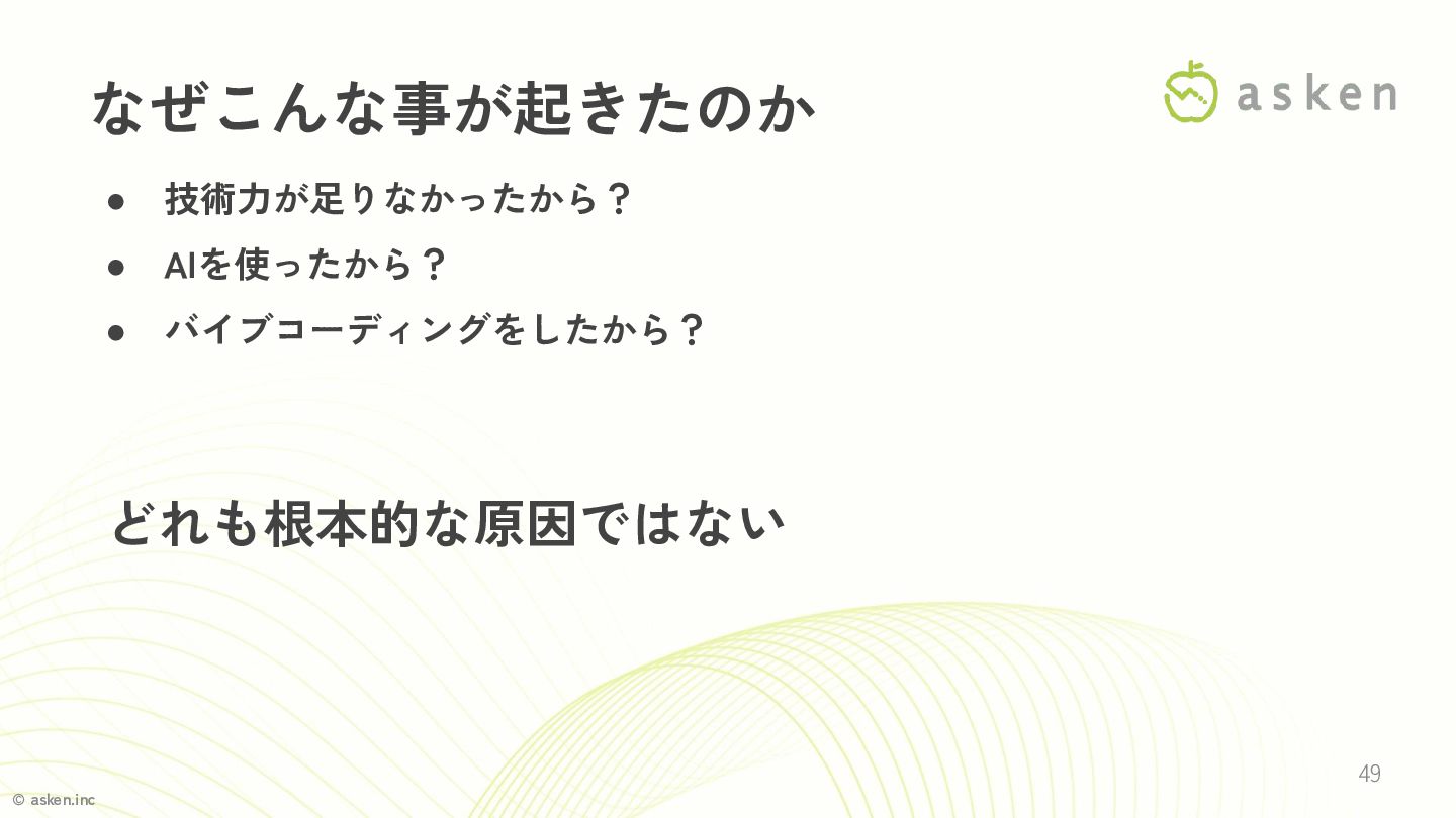 © asken.inc 49 なぜこんな事が起きたのか • 技術力が足りなかったから? • AIを使ったから? • バイブコーディングをしたから?