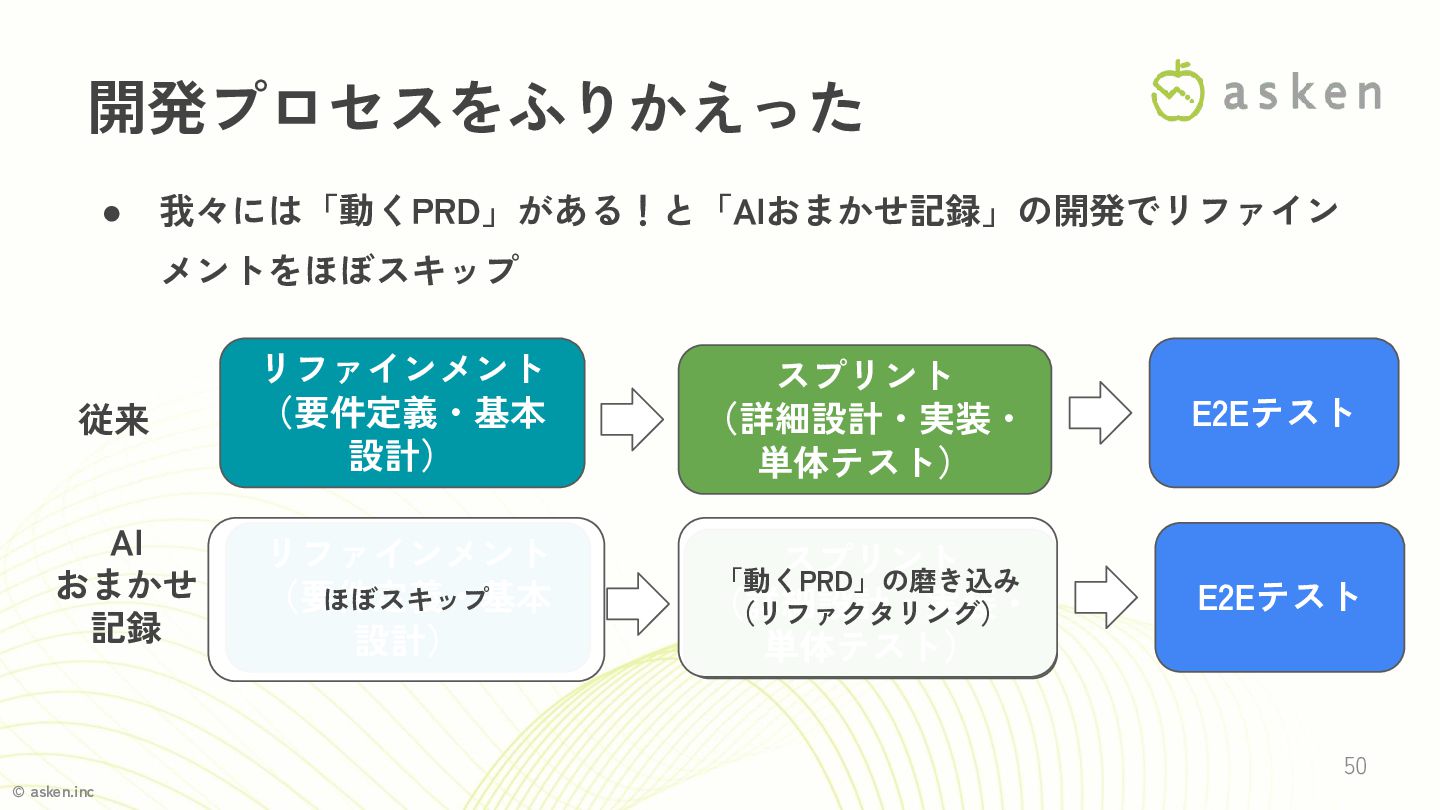 © asken.inc • 我々には「動くPRD」がある!と「AIおまかせ記録」の開発でリファイン メントをほぼスキップ 50 開発プロセスをふりかえった 従来 AI おまかせ