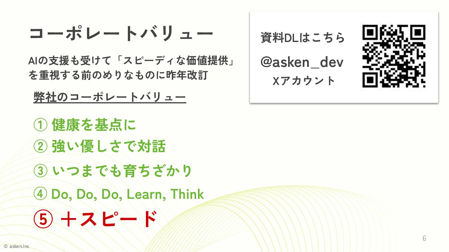 強い優しさで対話 ③ いつまでも育ちざかり ④ Do, Do, Do, Learn, Think ⑤ +スピード 資料DLはこちら @asken_dev Xアカウント