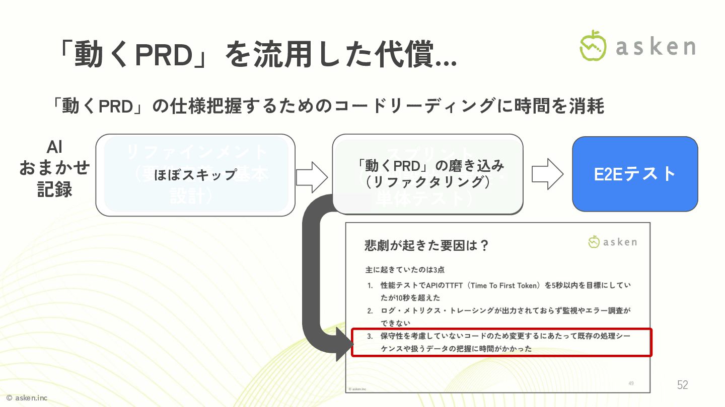 © asken.inc 「動くPRD」の仕様把握するためのコードリーディングに時間を消耗 52 「動くPRD」を流用した代償... AI おまかせ 記録 E2Eテスト リファインメント