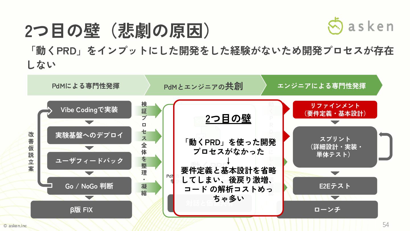 Vibe Codingで実装 実験基盤へのデプロイ ユーザフィードバック Go / NoGo 判断 β版 FIX 動くPRD PdMの意図/ユーザの声/ログデータからの 学びが凝縮されたDocsと動作済コード 対話と価値共有 リファインメント (要件定義・基本設計) スプリント (詳細設計・実装・ 単体テスト) E2Eテスト ローンチ 動 く P R D を 基 に し た 価 値 確 認 検 証 プ ロ セ ス 全 体 を 整 理 ・ 凝 縮 PdMとエンジニアの共創 「動くPRD」をインプットにした開発をした経験がないため開発プロセスが存在 しない 2つ目の壁(悲劇の原因) 54 2つ目の壁 「動くPRD」を使った開発 プロセスがなかった ↓ 要件定義と基本設計を省略 してしまい、後戻り激増、 コード の解析コストめっ ちゃ多い