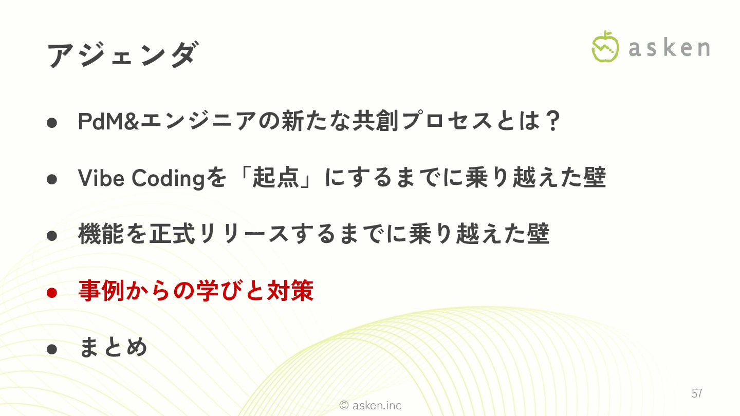 © asken.inc 57 • PdM&エンジニアの新たな共創プロセスとは? • Vibe Codingを「起点」にするまでに乗り越えた壁 • 機能を正式リリースするまでに乗り越えた壁