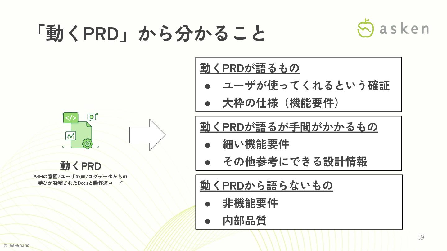 © asken.inc 「動くPRD」から分かること 59 動くPRD PdMの意図/ユーザの声/ログデータからの 学びが凝縮されたDocsと動作済コード 動くPRDが語るもの • ユーザが使ってくれるという確証